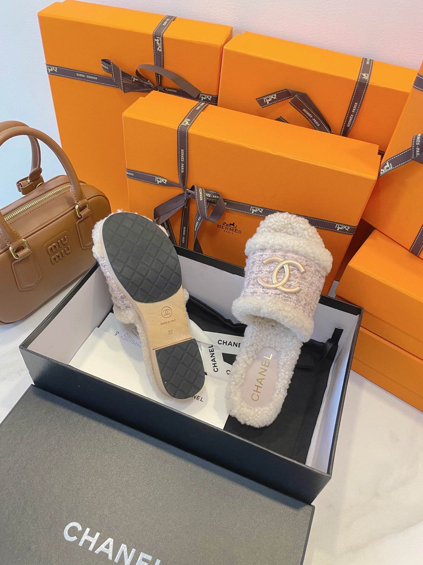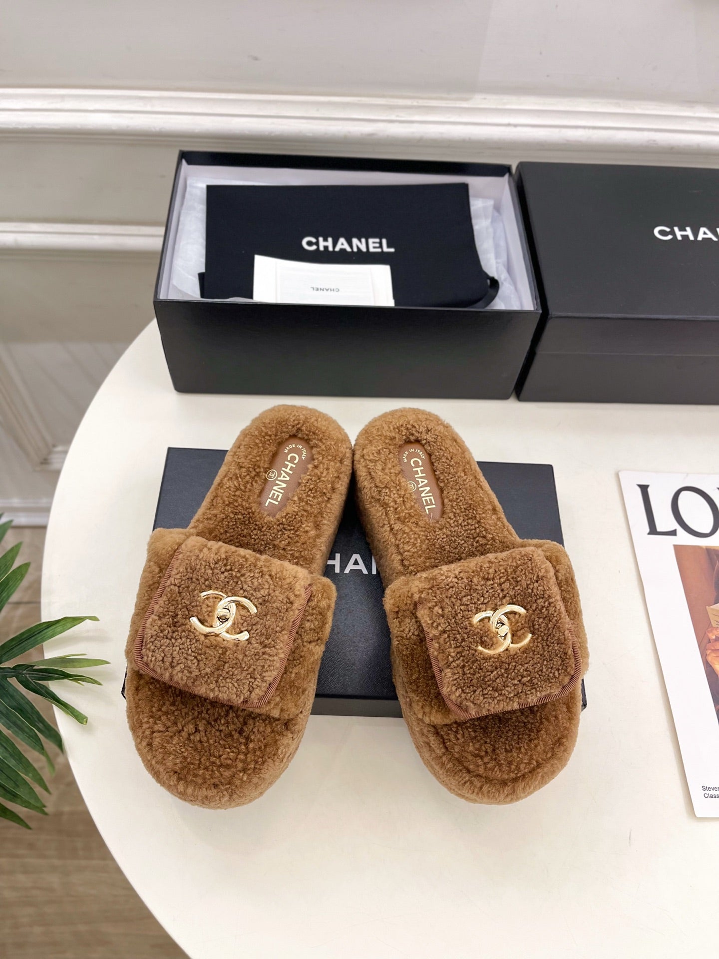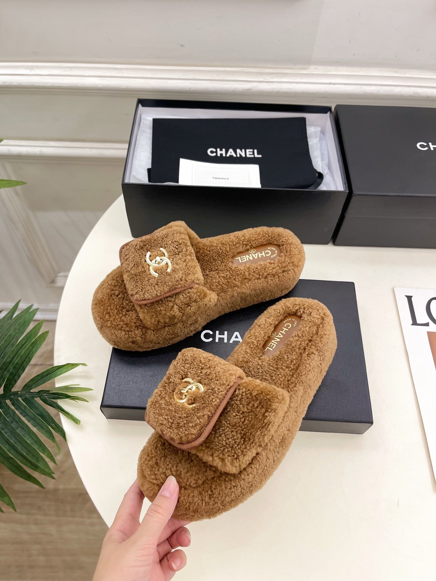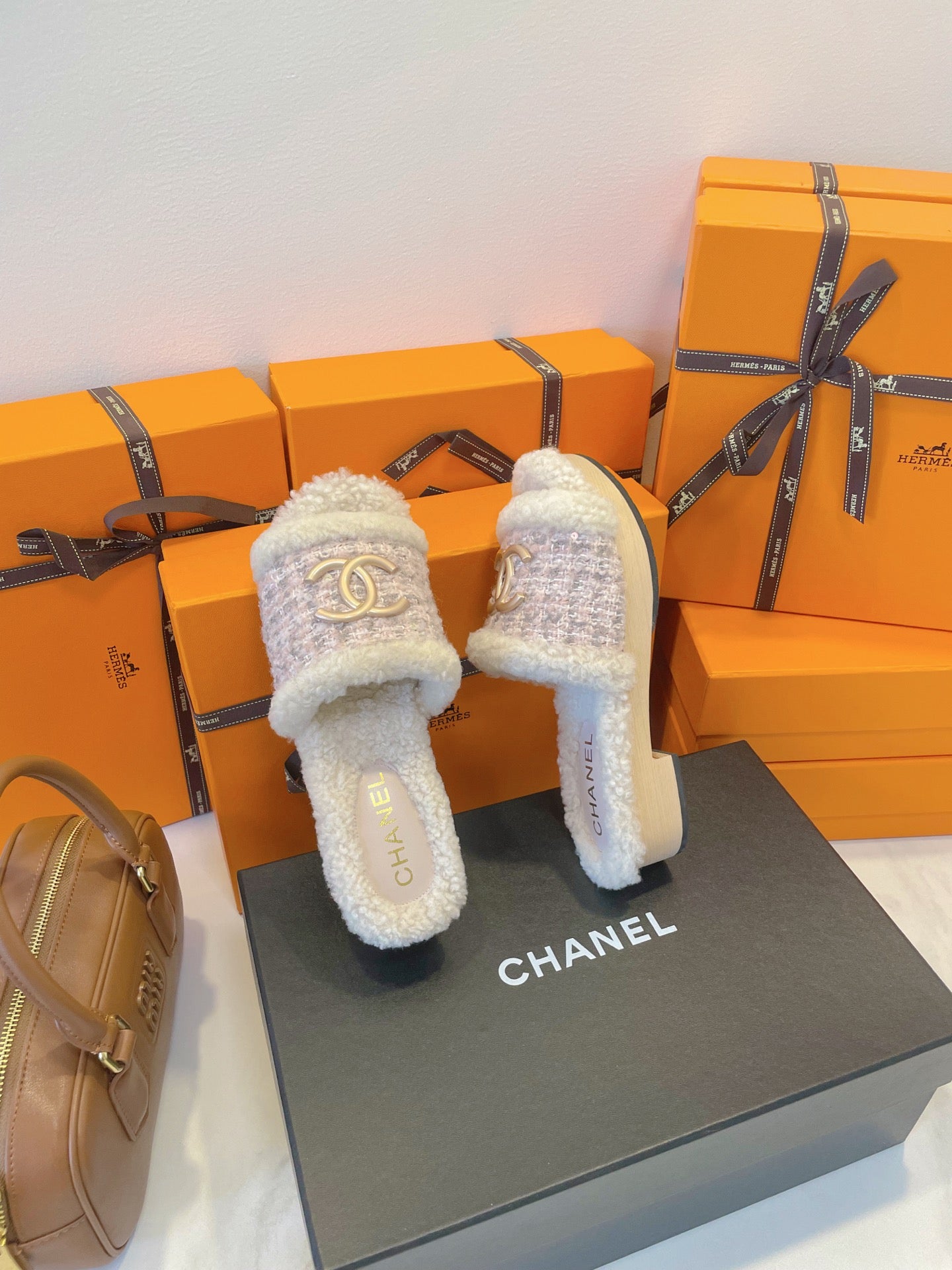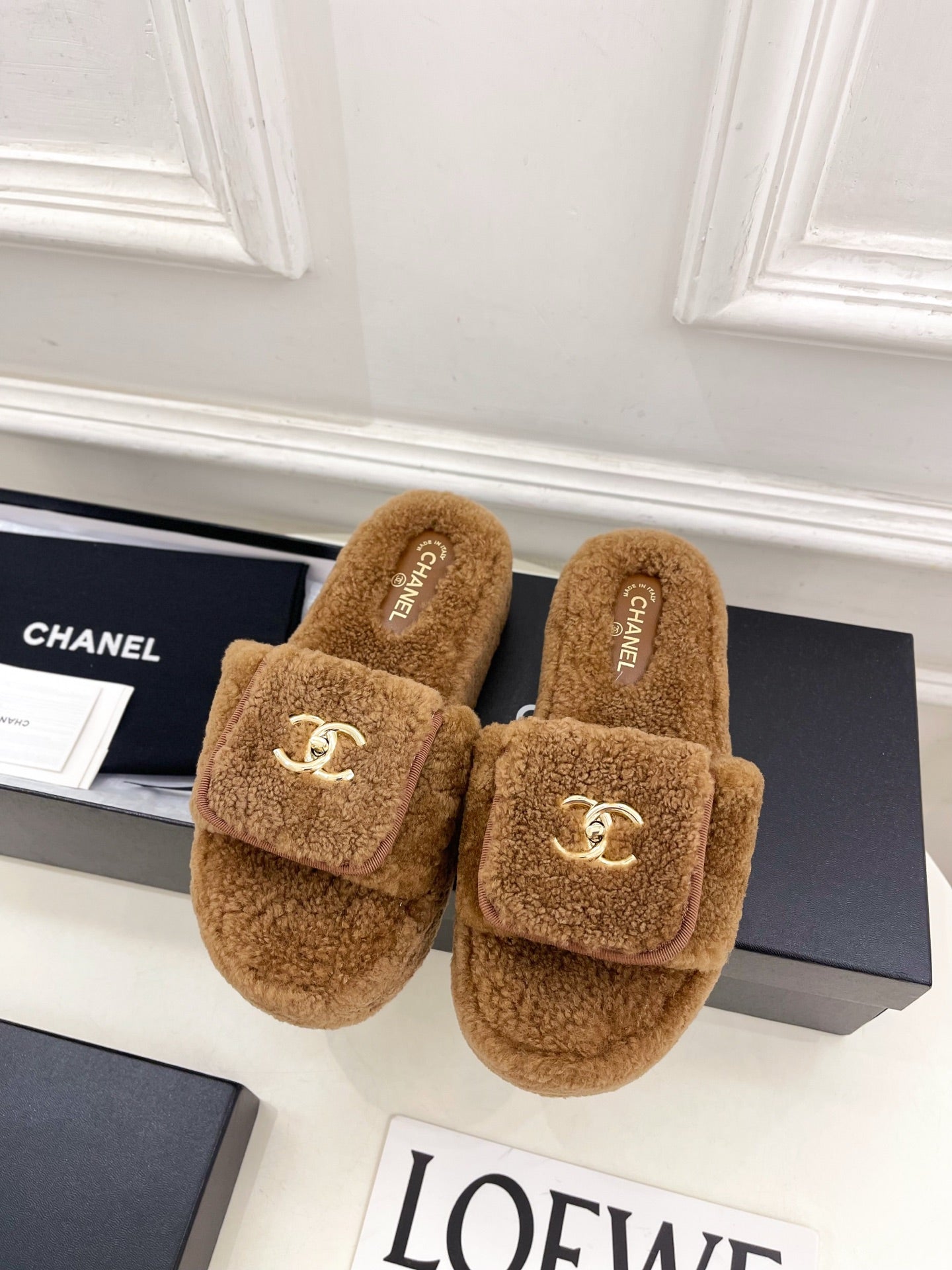 CC 25s Logo Slippers 50mm Brown Wool GHW 435263