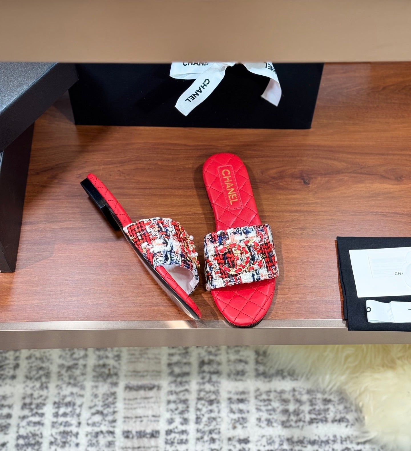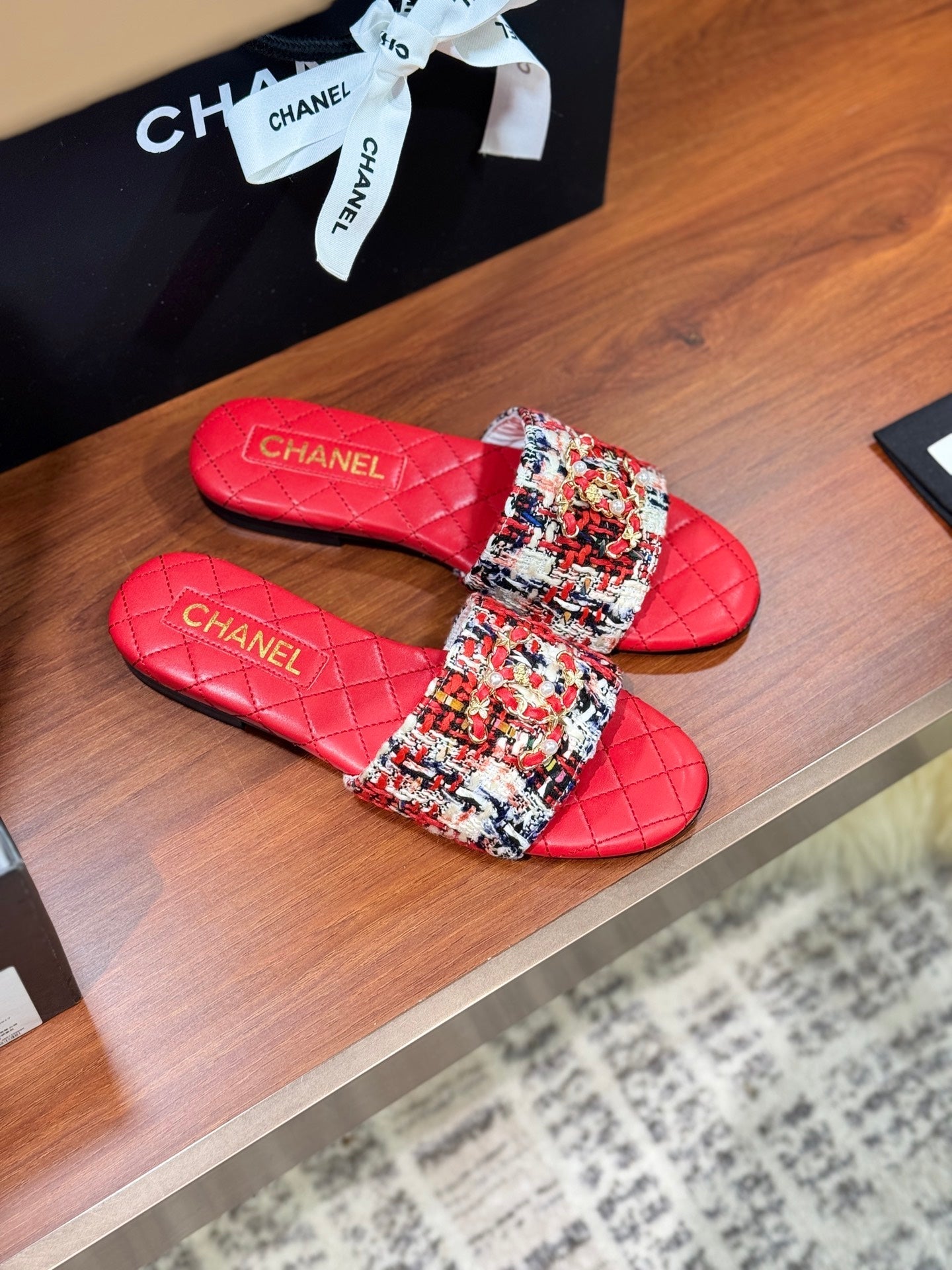 CC Chain Strap Thong Slippers Red Cloth Sheepskin Velvet 305868