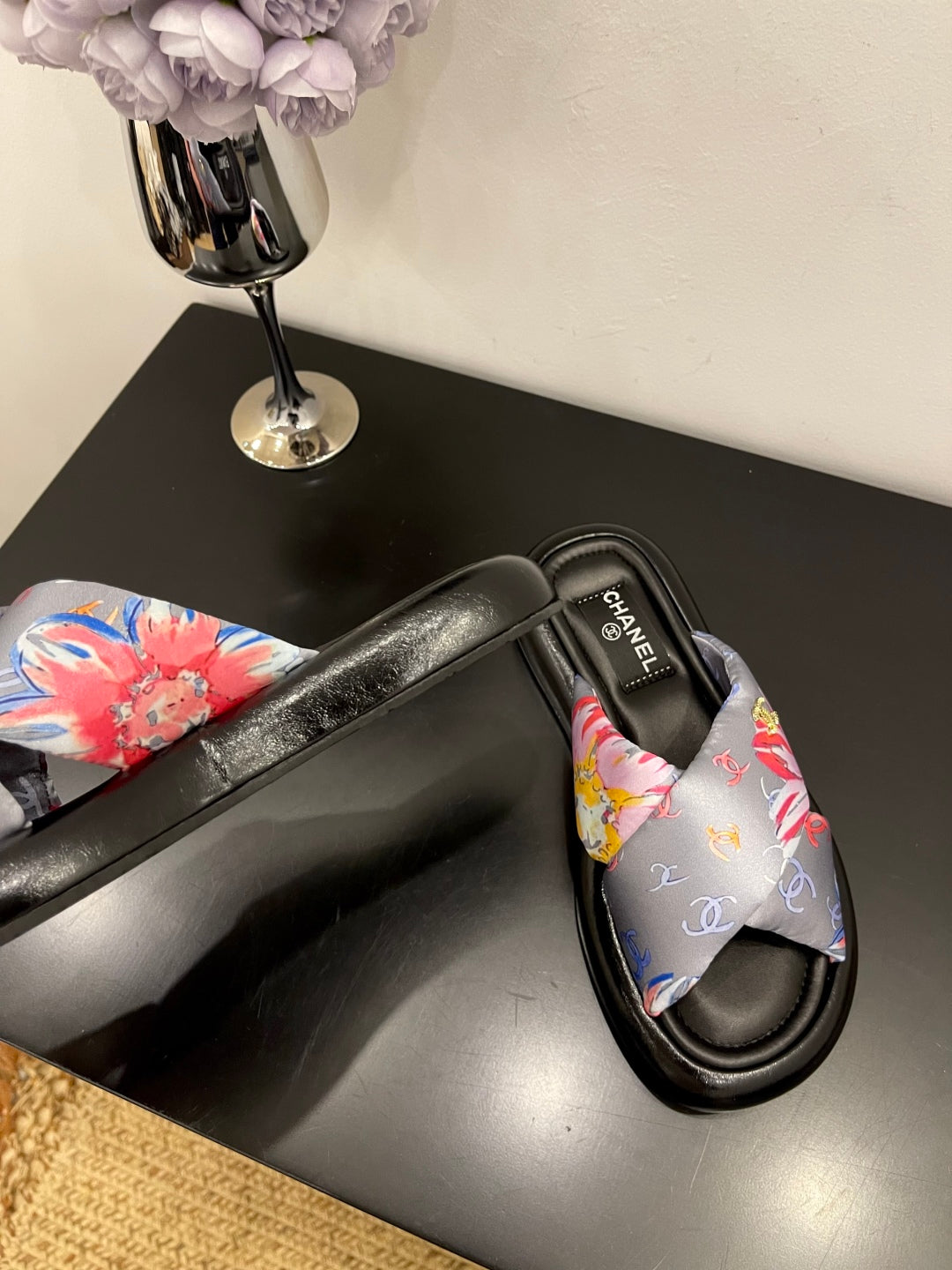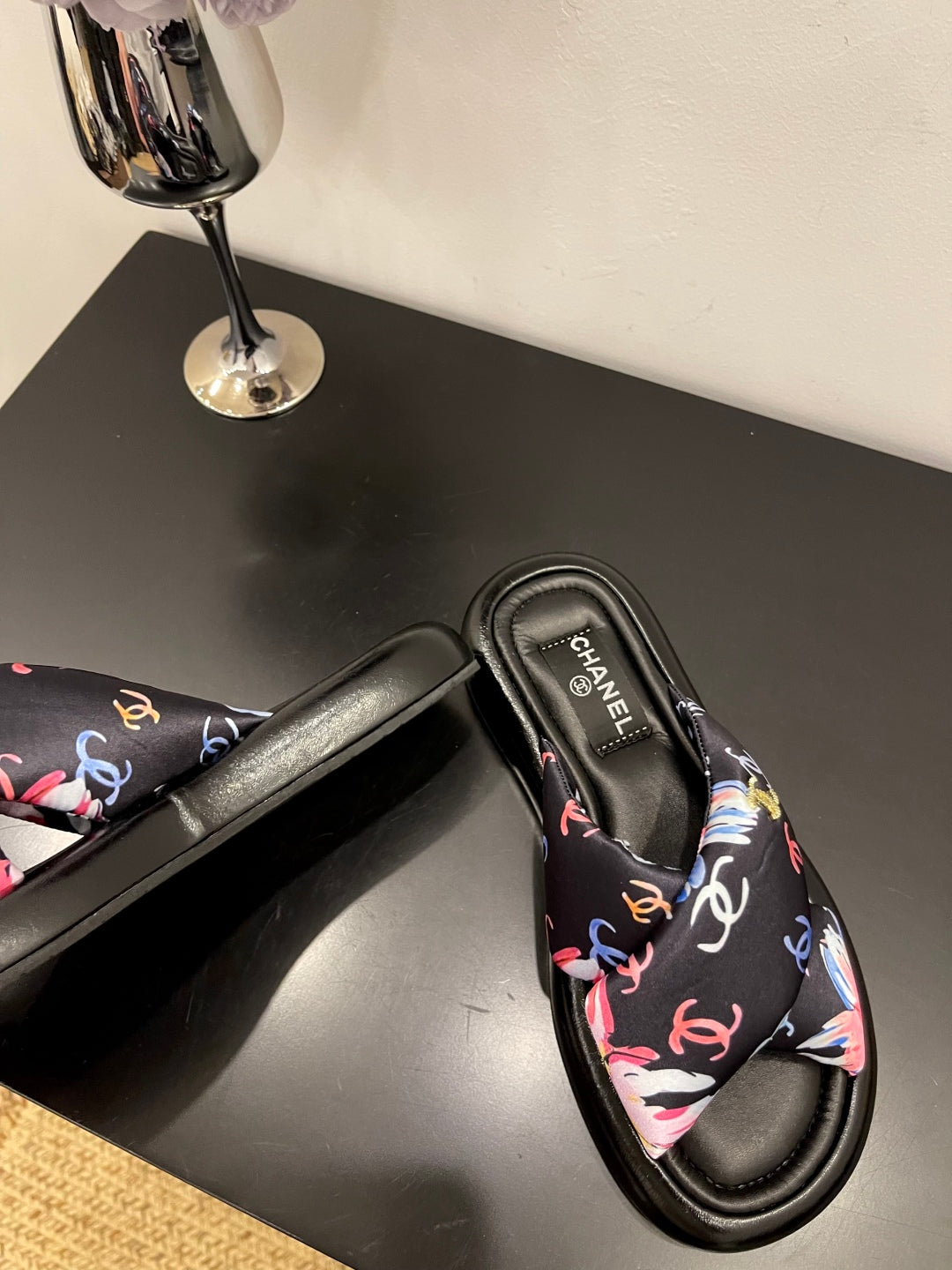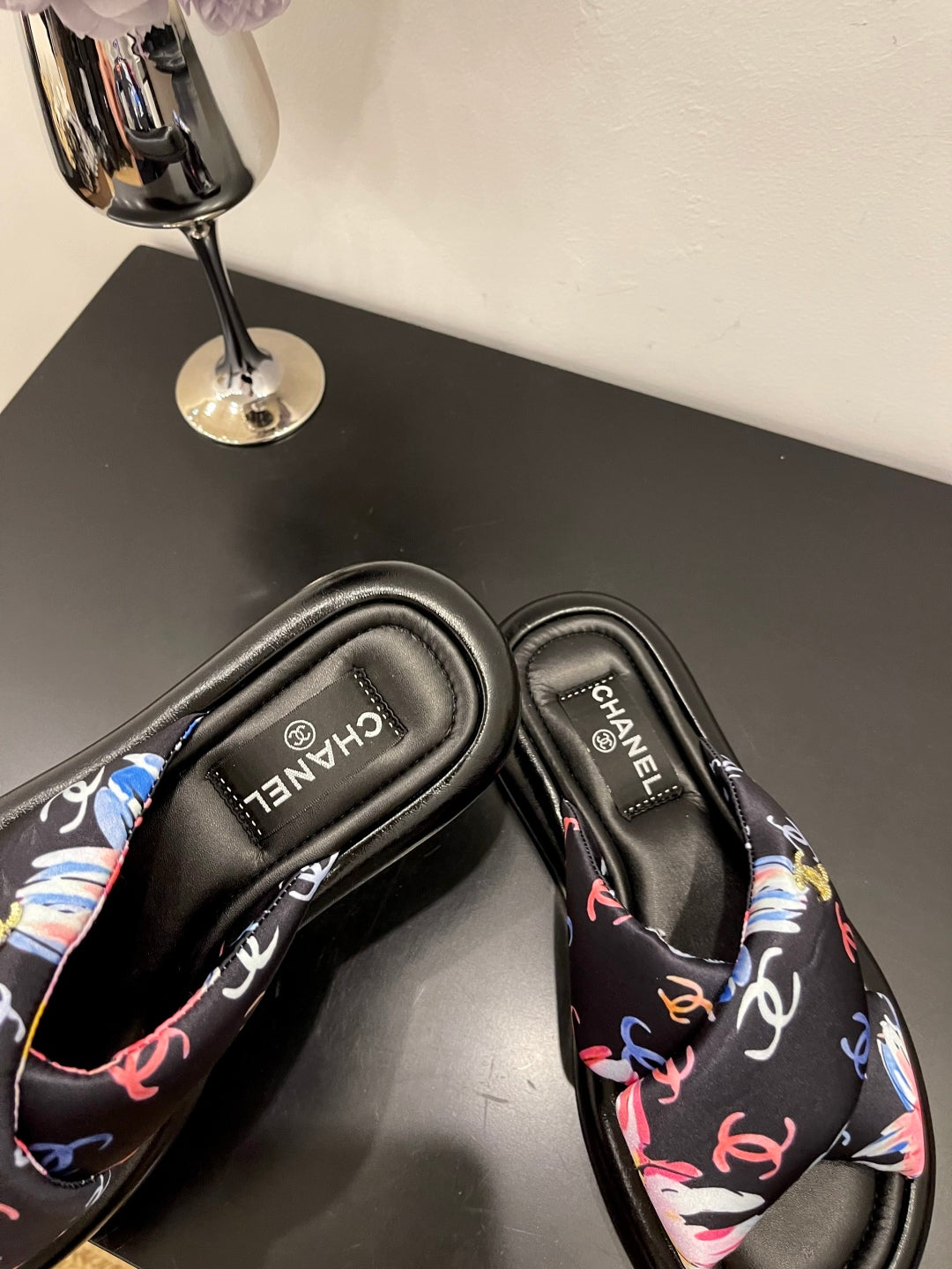 CC 25 Camellia Thong Sandals Black Sheepskin And Fabric 368838