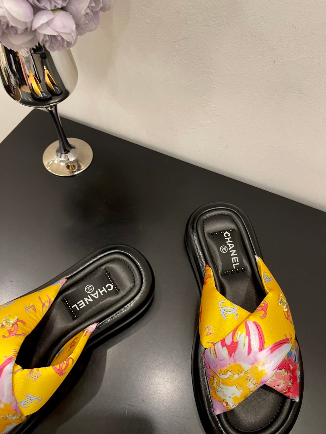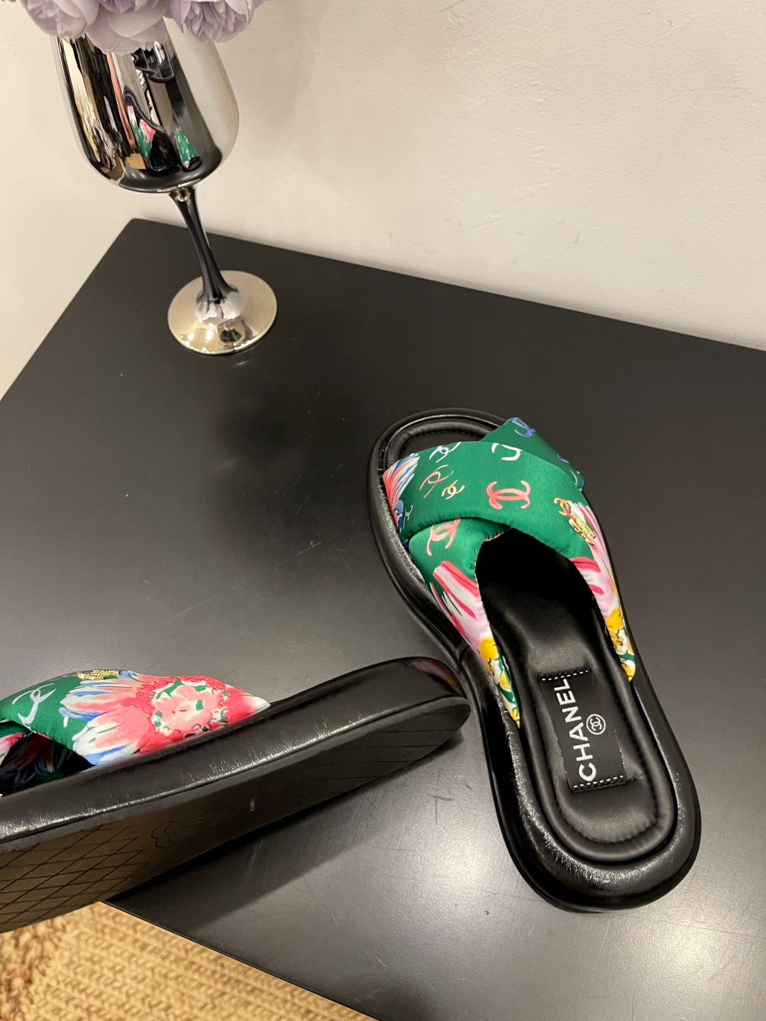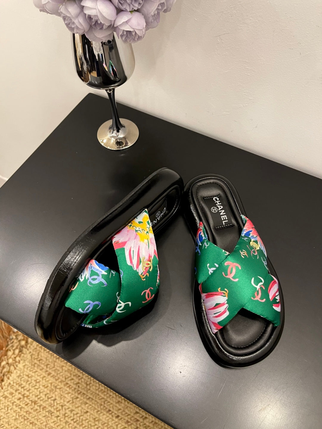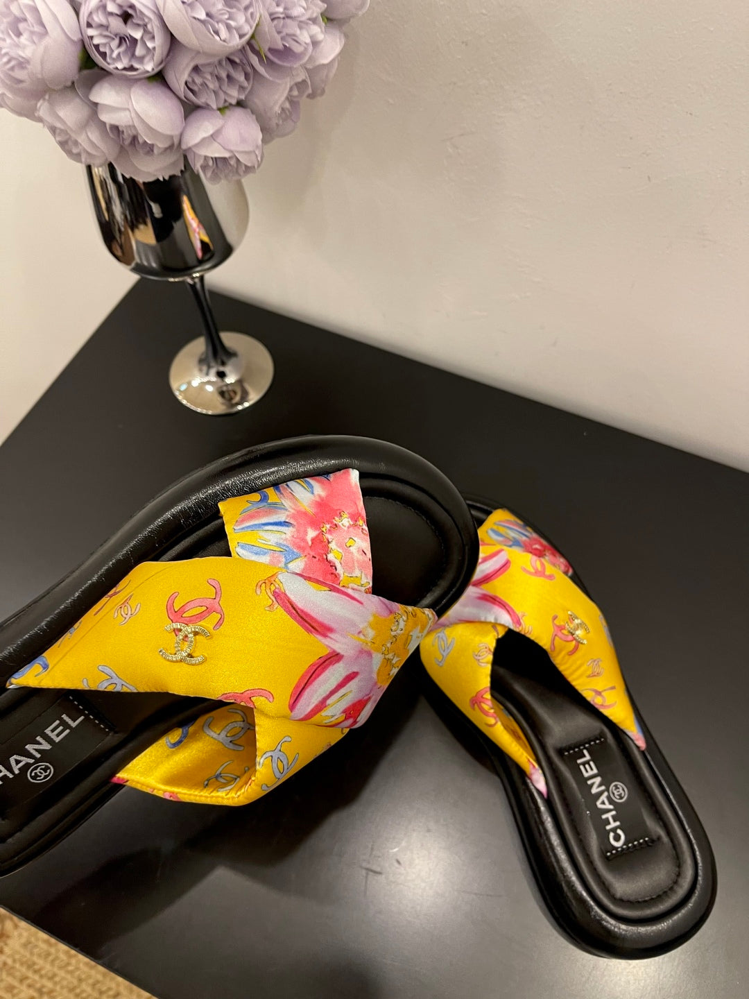 CC 25 Camellia Thong Sandals Black Sheepskin And Fabric 368838