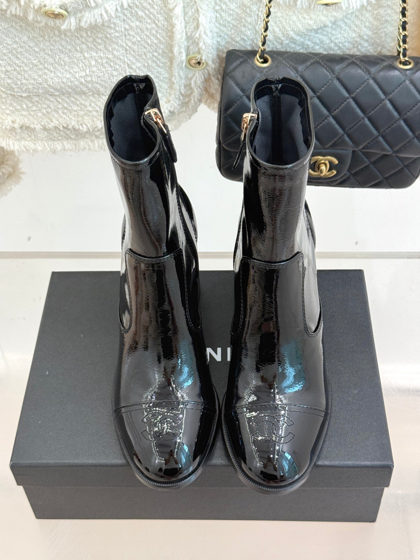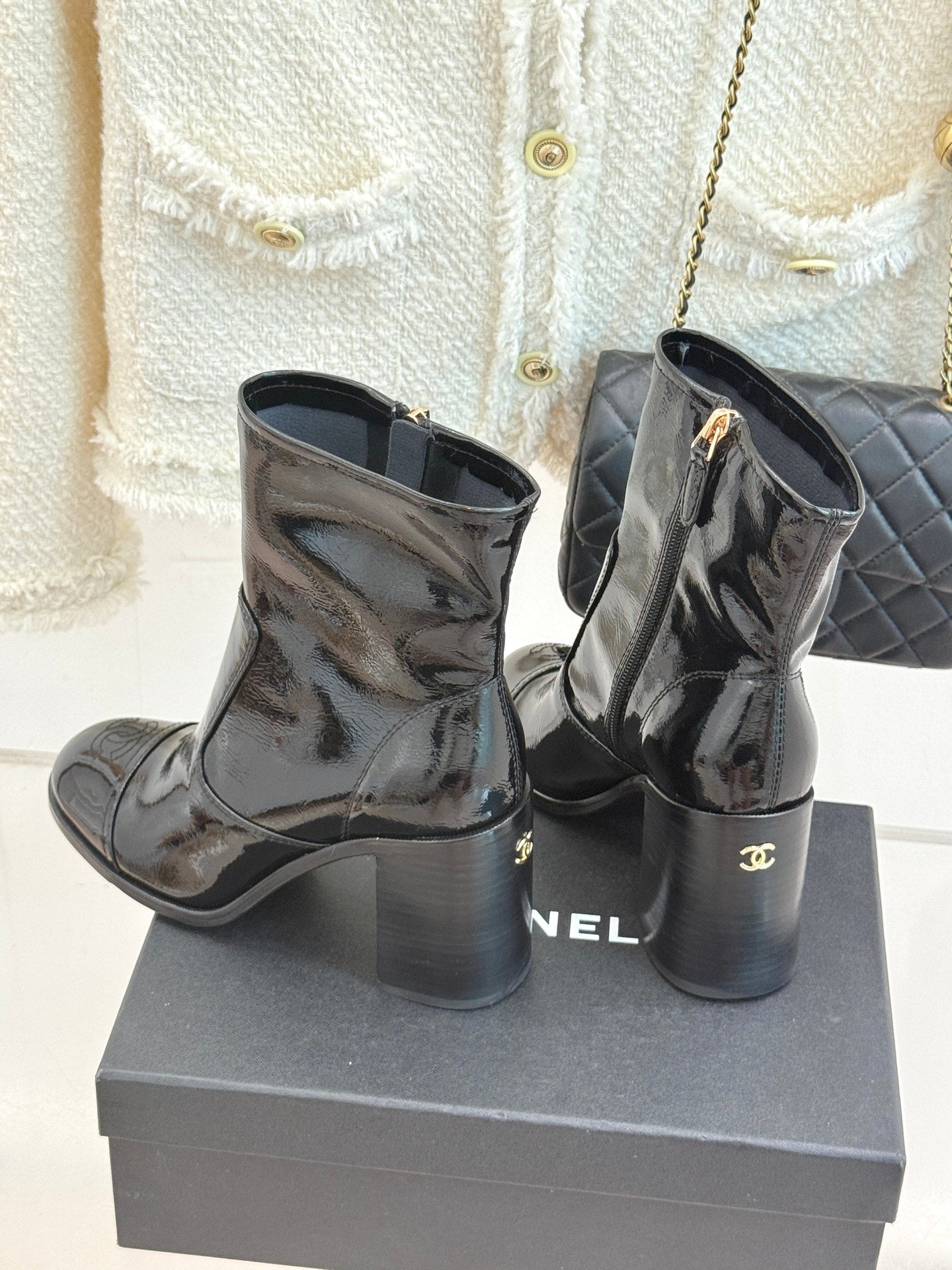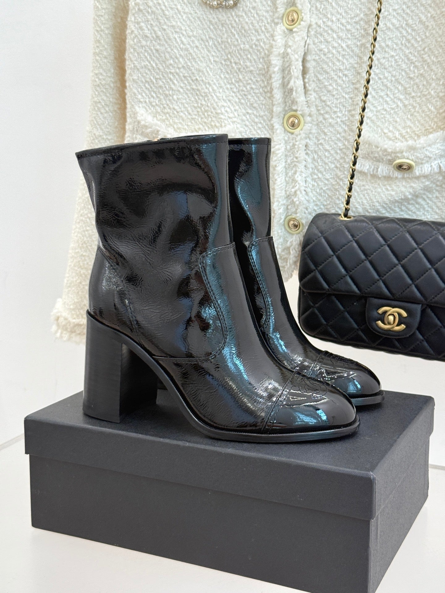CC Classic Short Boots Block Heel 90mm Black Patent Leather 465391