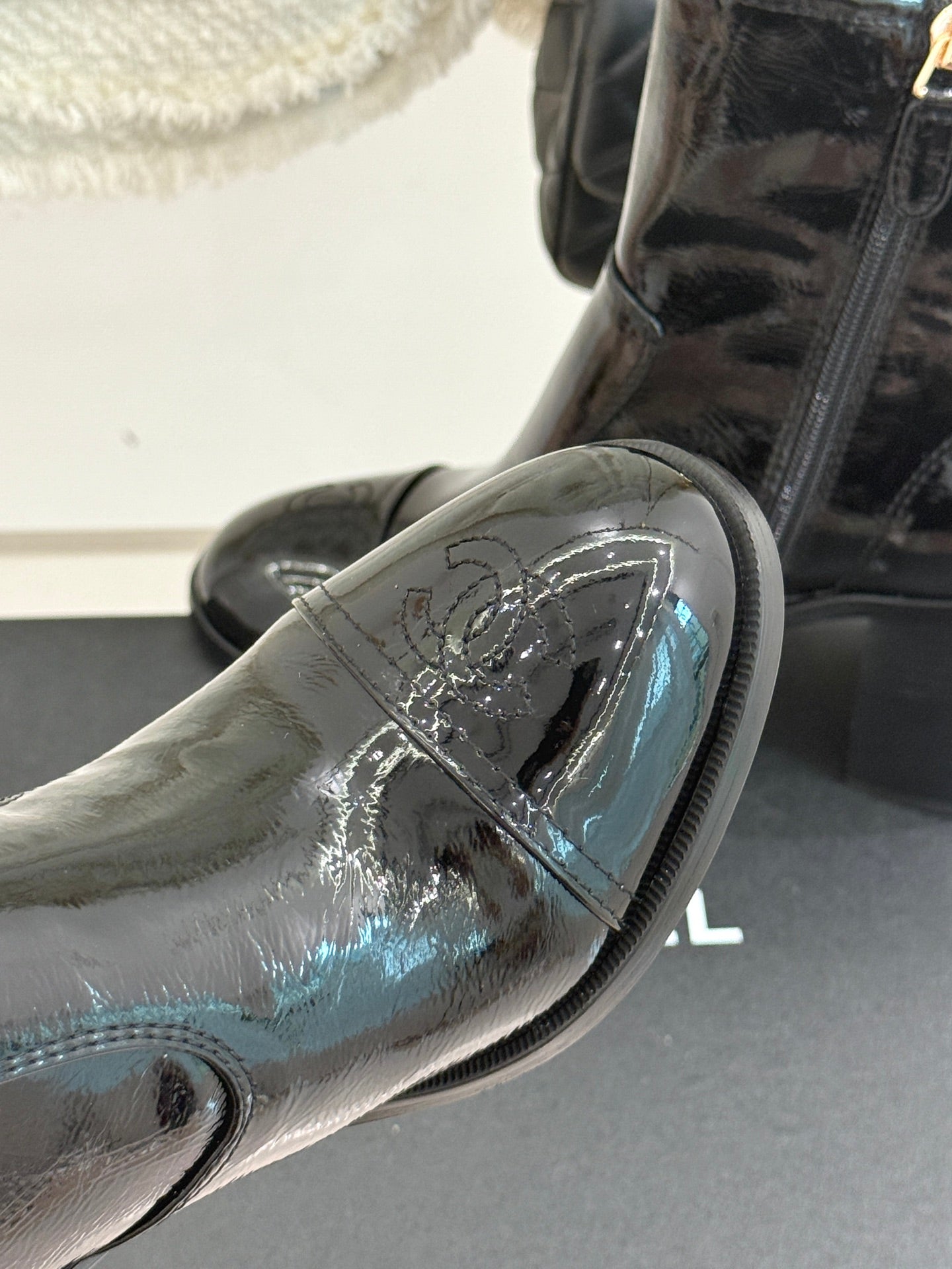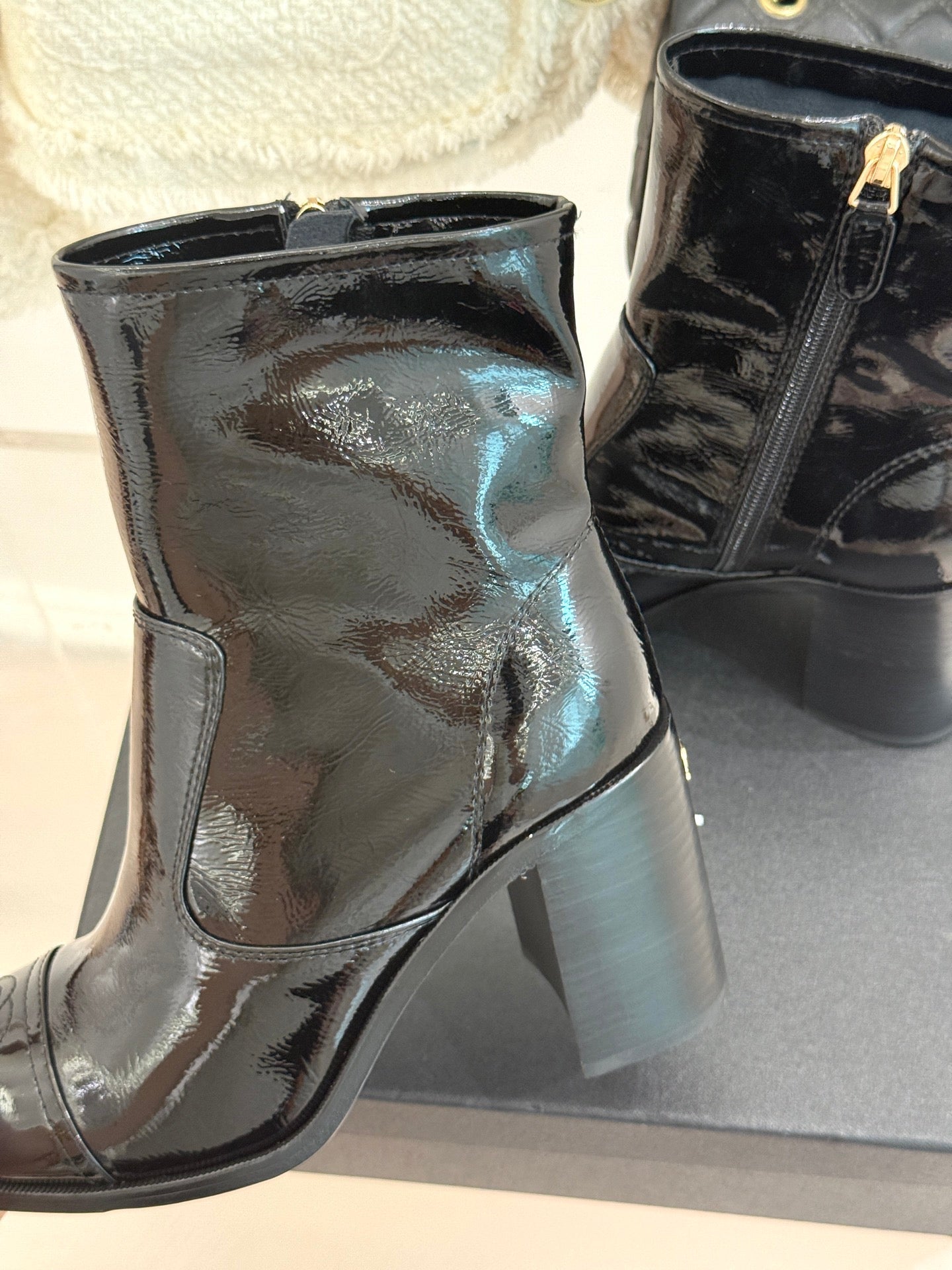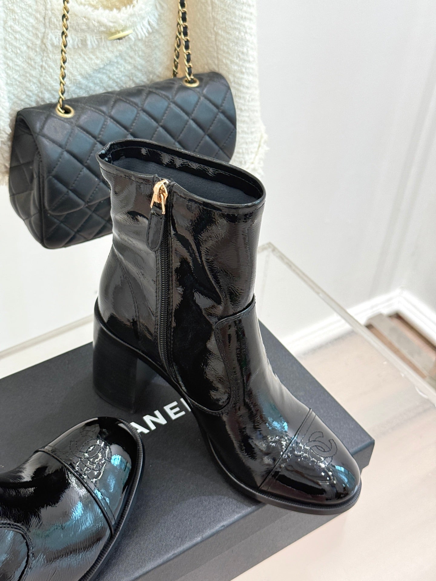 CC Classic Short Boots Block Heel 90mm Black Patent Leather 465391