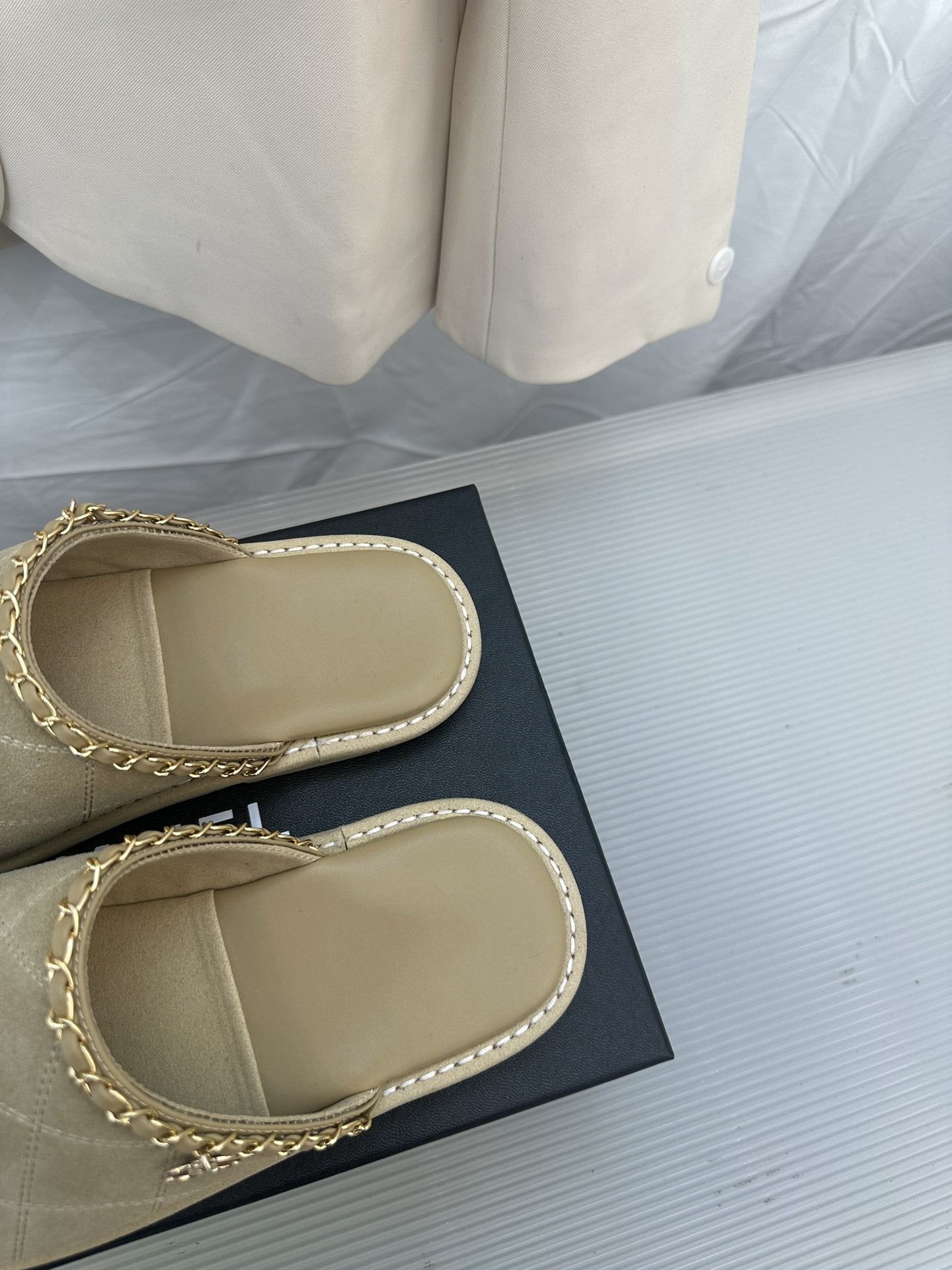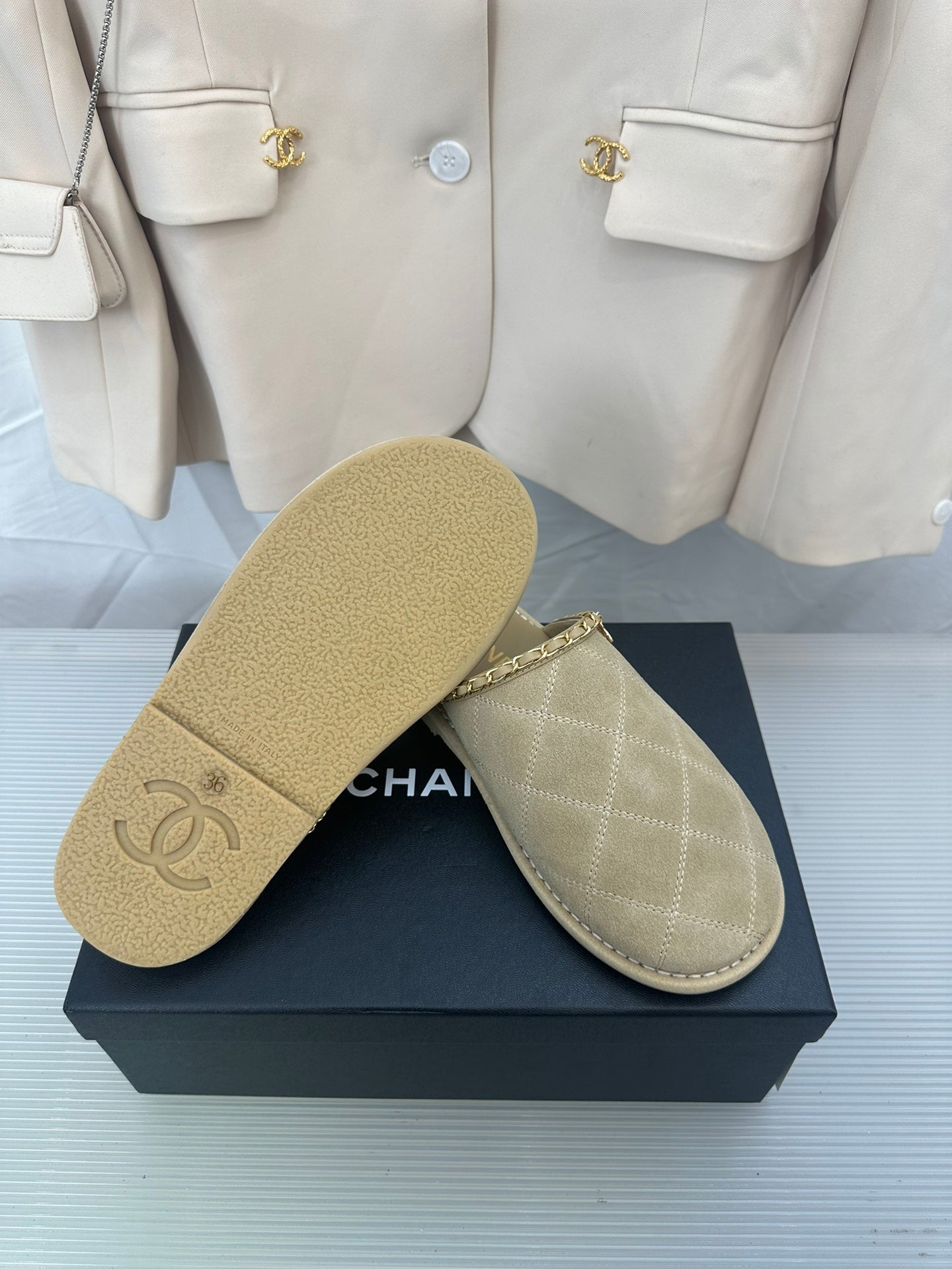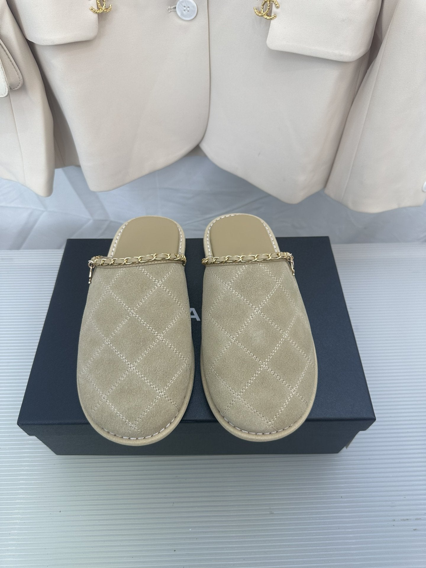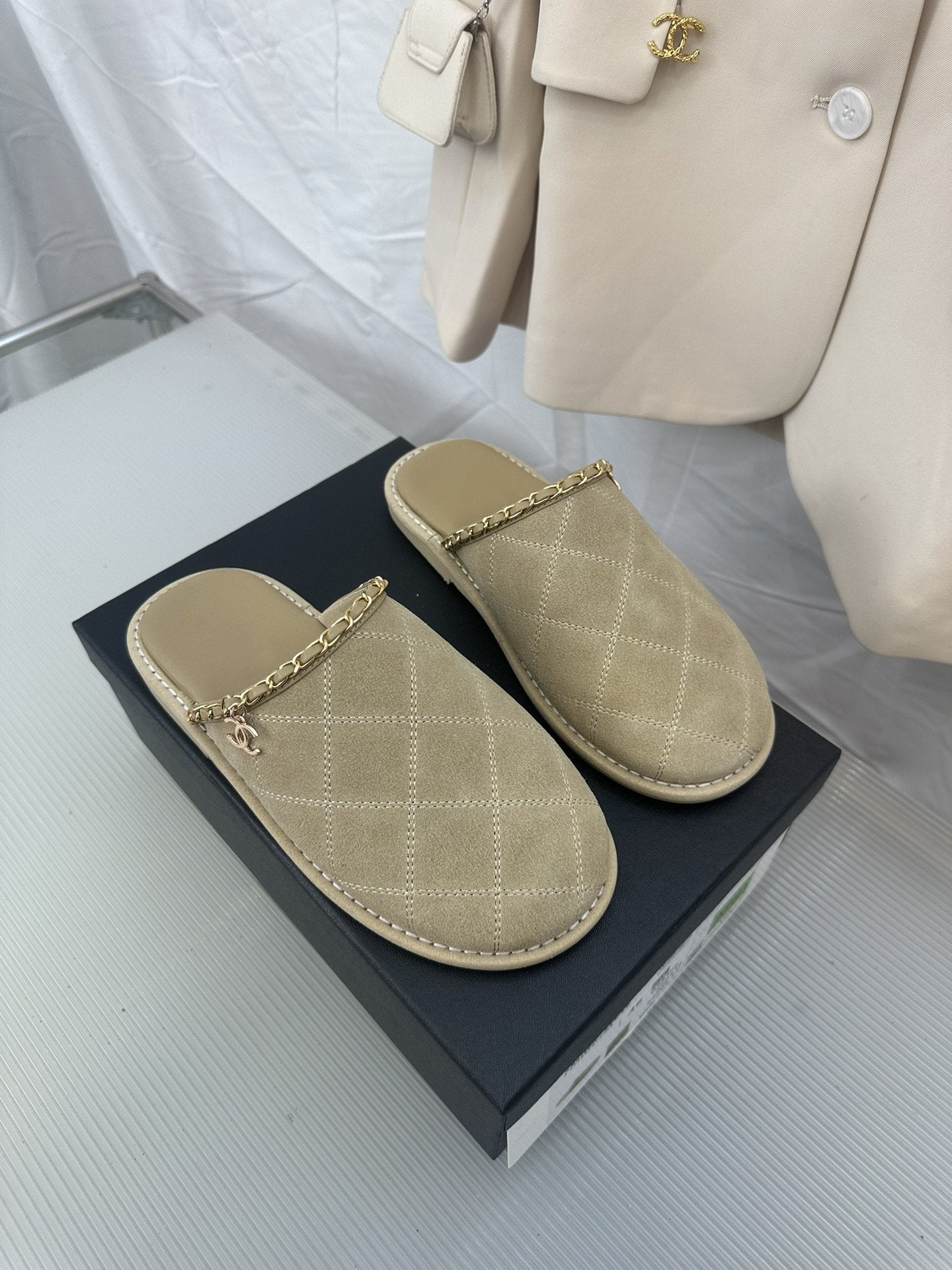 CC Khaki Green Suede Gold Chain Mules