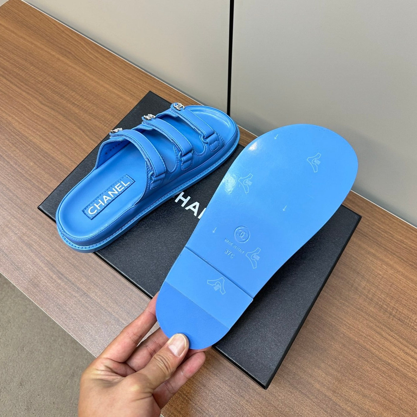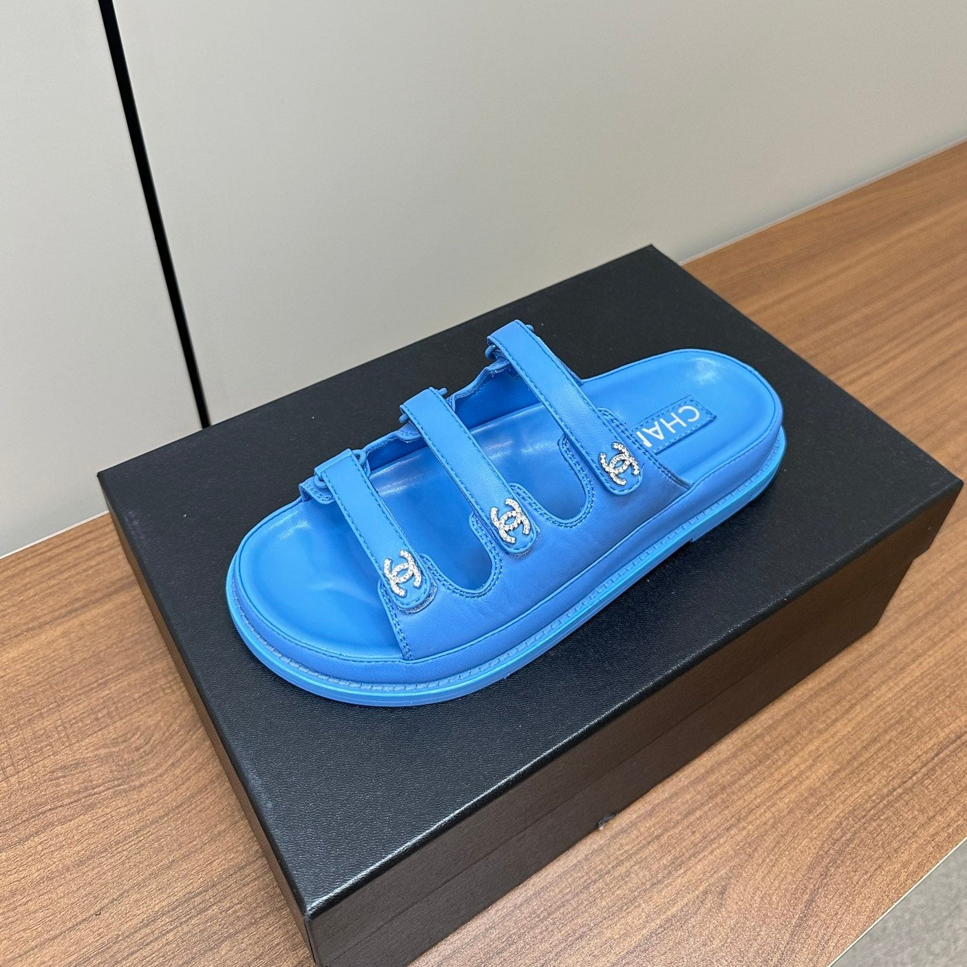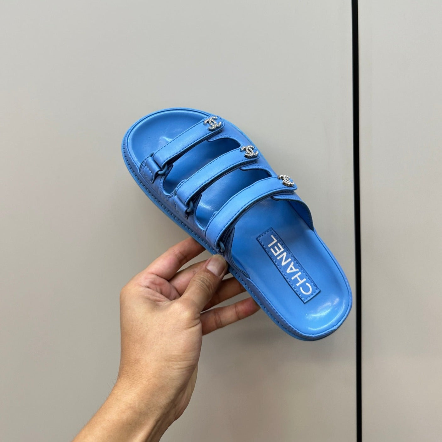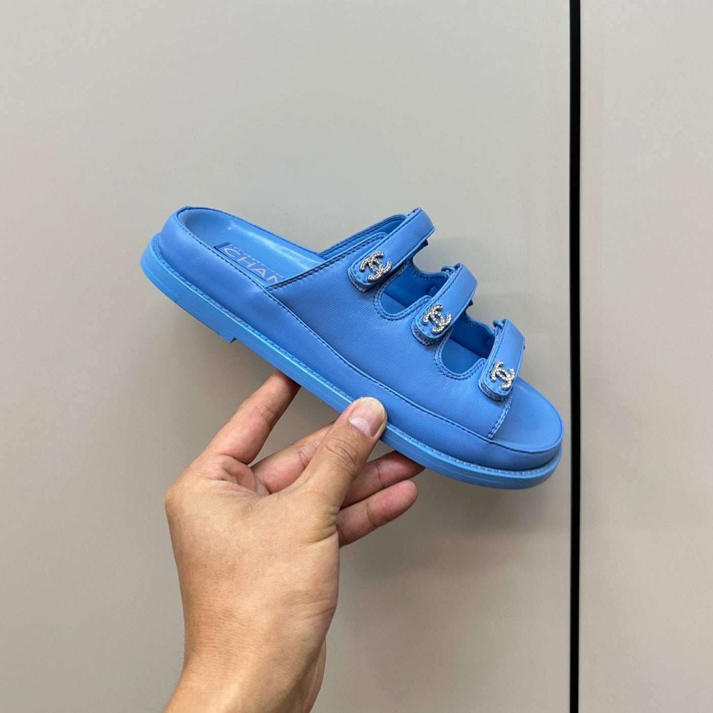 dad sandals dodger blue triple strap lambskin mules