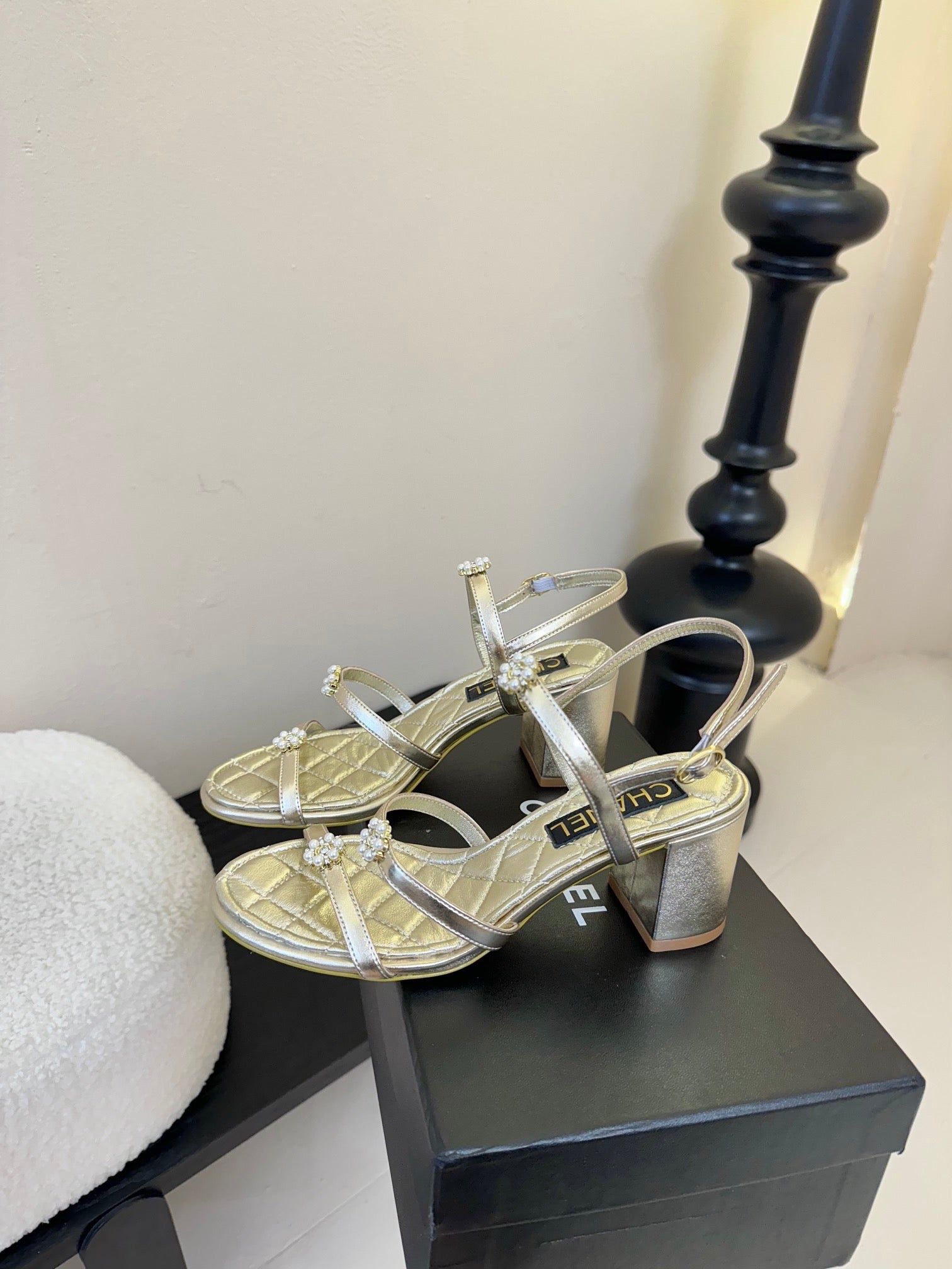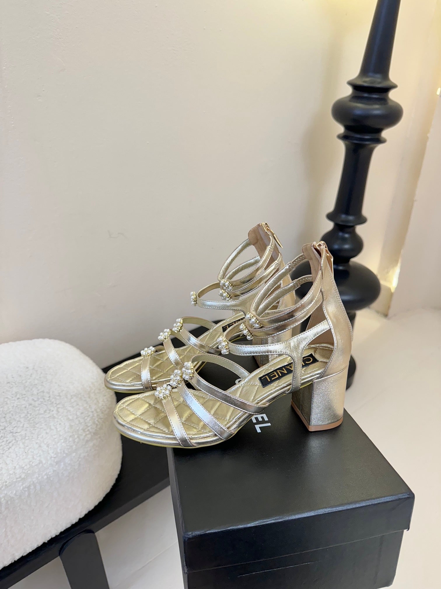 CC 25SS Camellia Multi Straps Heel Sandal 60mm Gold Metallic Sheepskin 351435