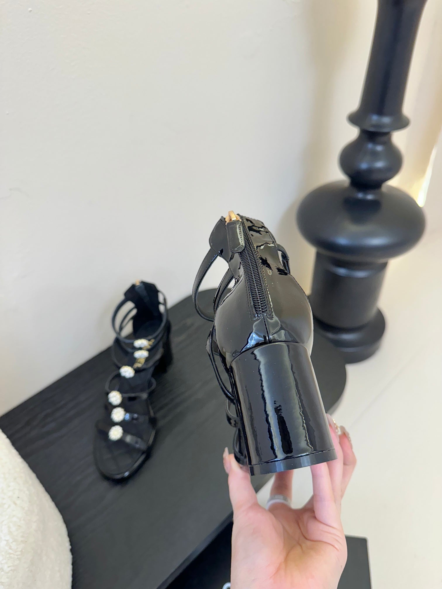 CC 25SS Camellia Multi Straps Heel Sandal 60mm Black Sheepskin 351434