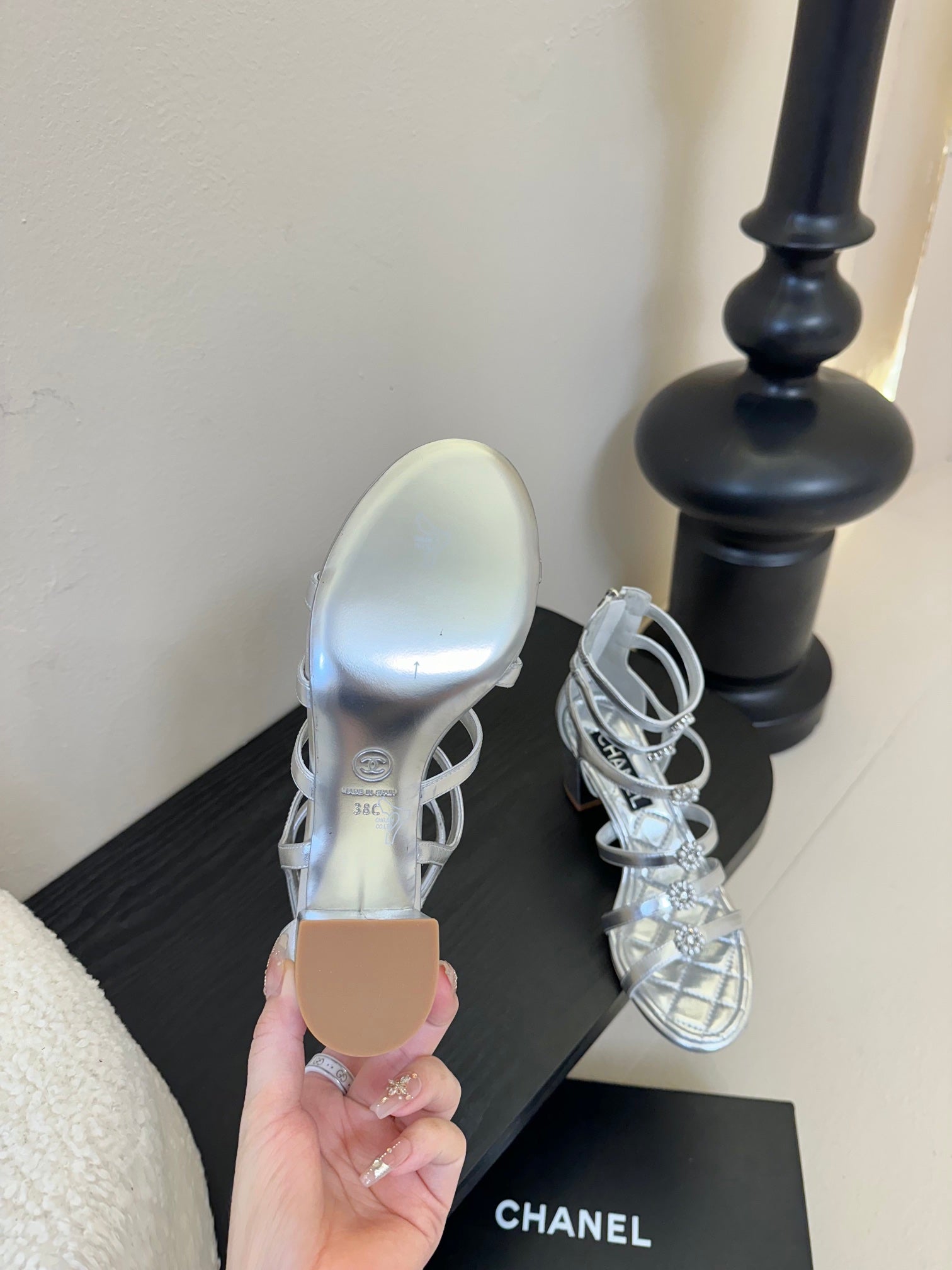 CC 25SS Camellia Multi Straps Heel Sandal 60mm Silver Metallic Sheepskin 351436