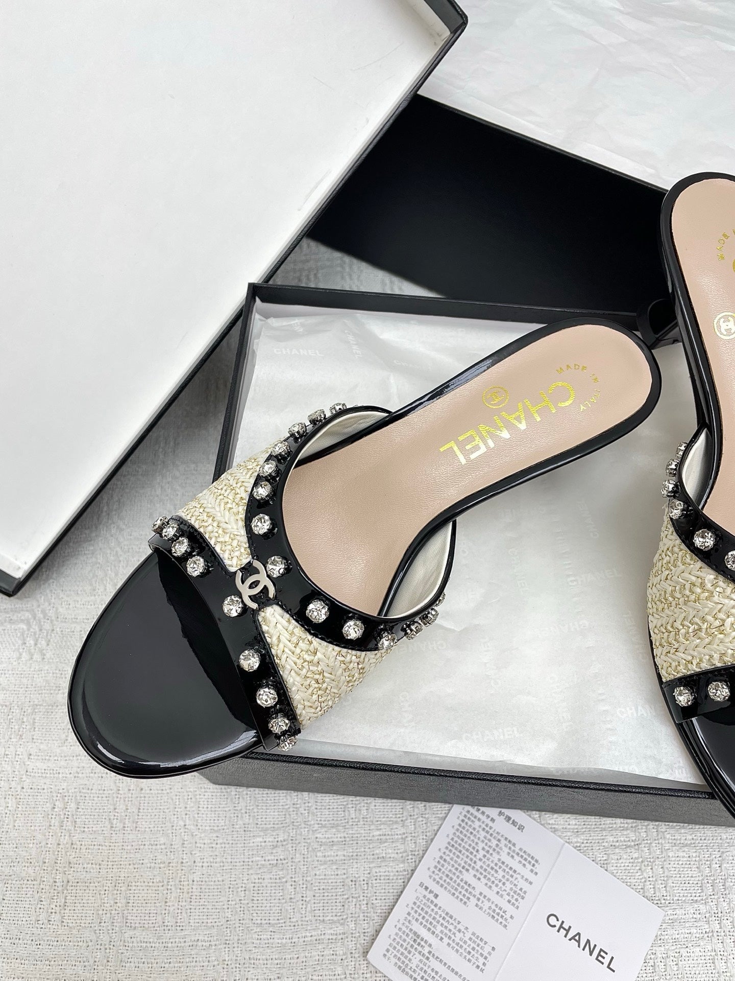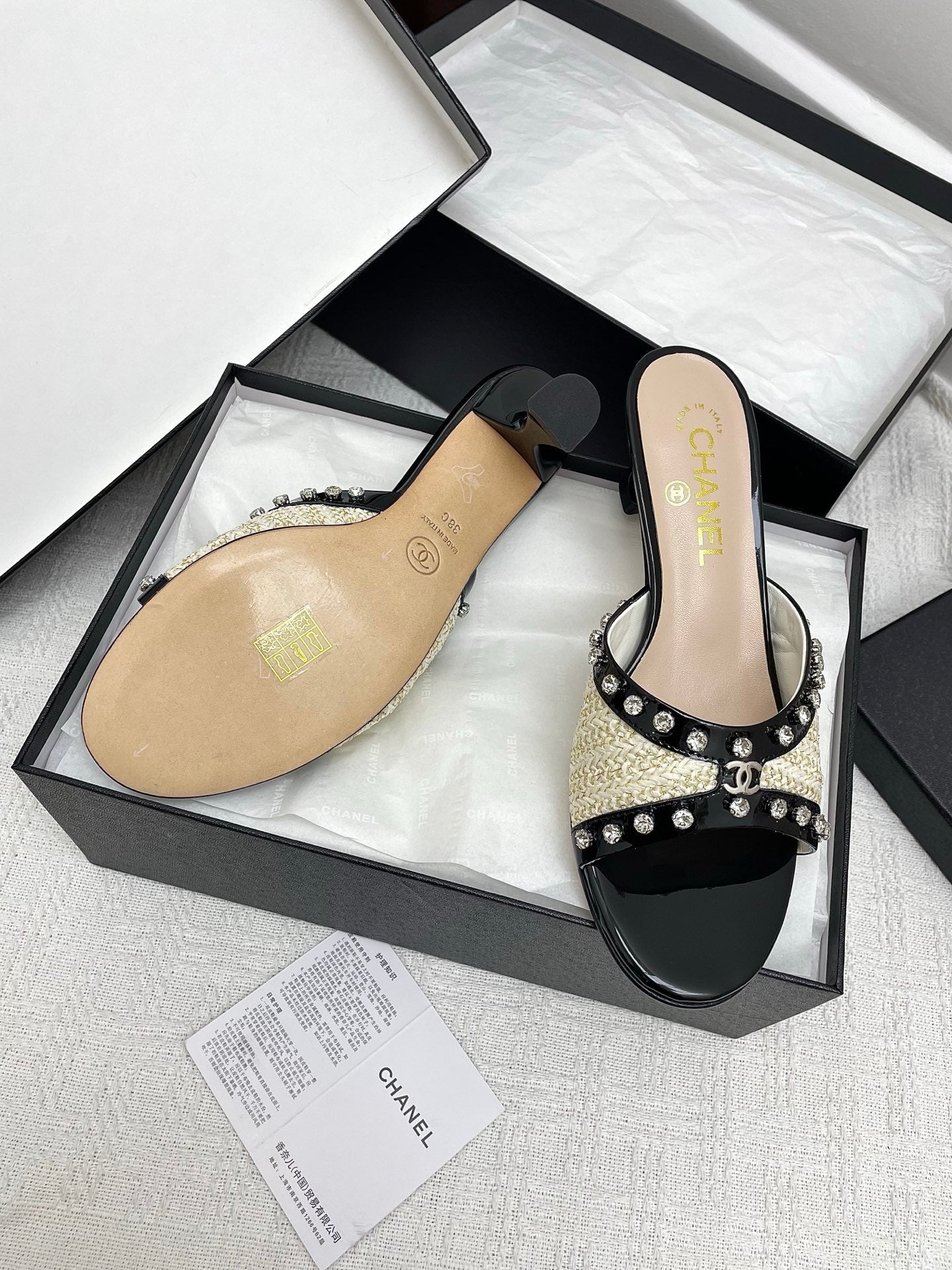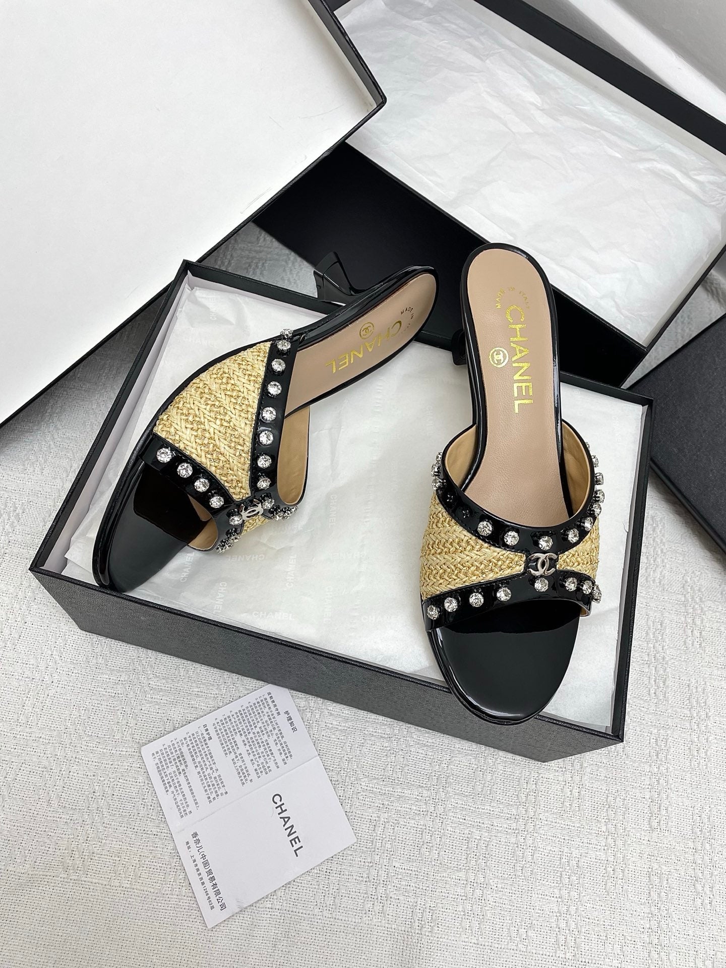 CC 25SS Slippers 5cm Light Yellow Raffia Black Patent Calfskin 338299