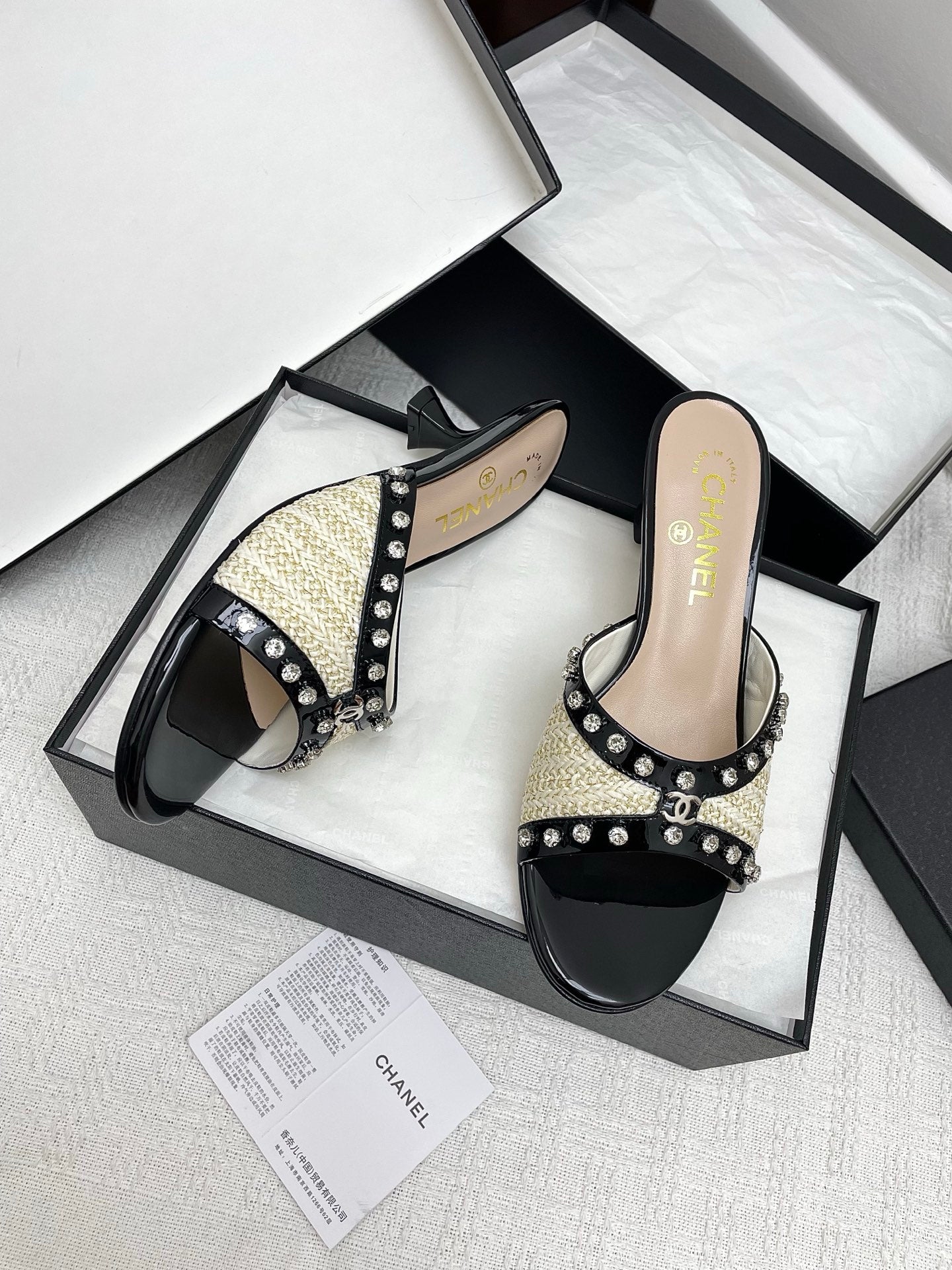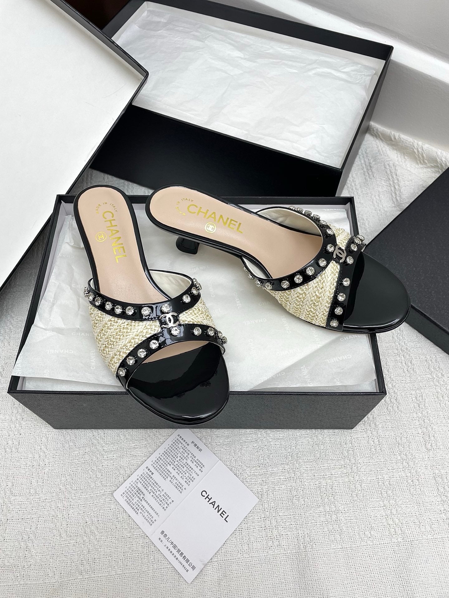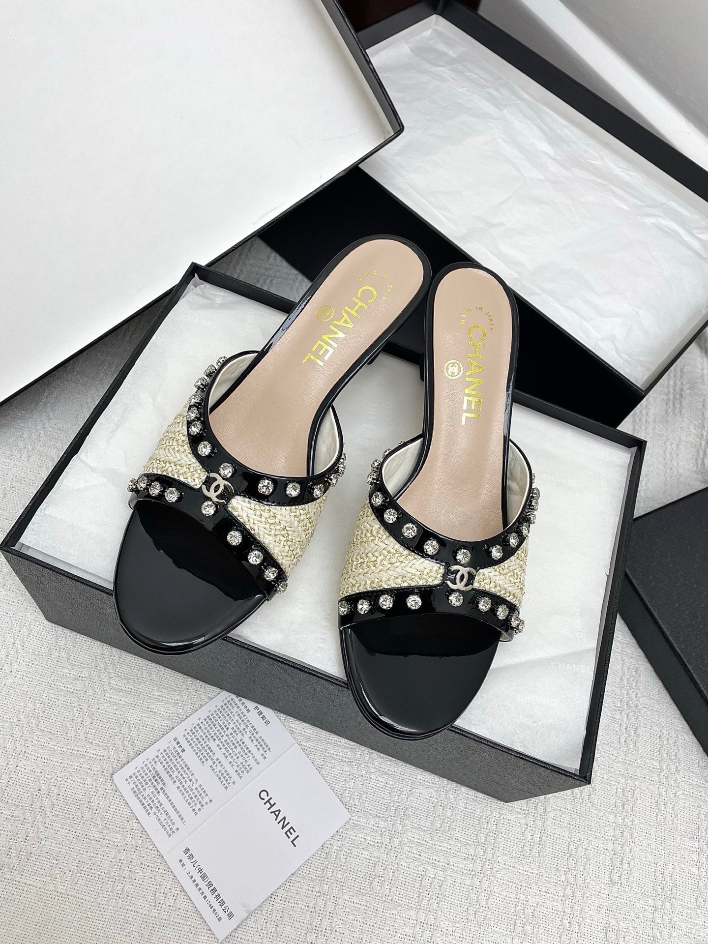 CC 25SS Slippers 5cm Light Yellow Raffia Black Patent Calfskin 338299