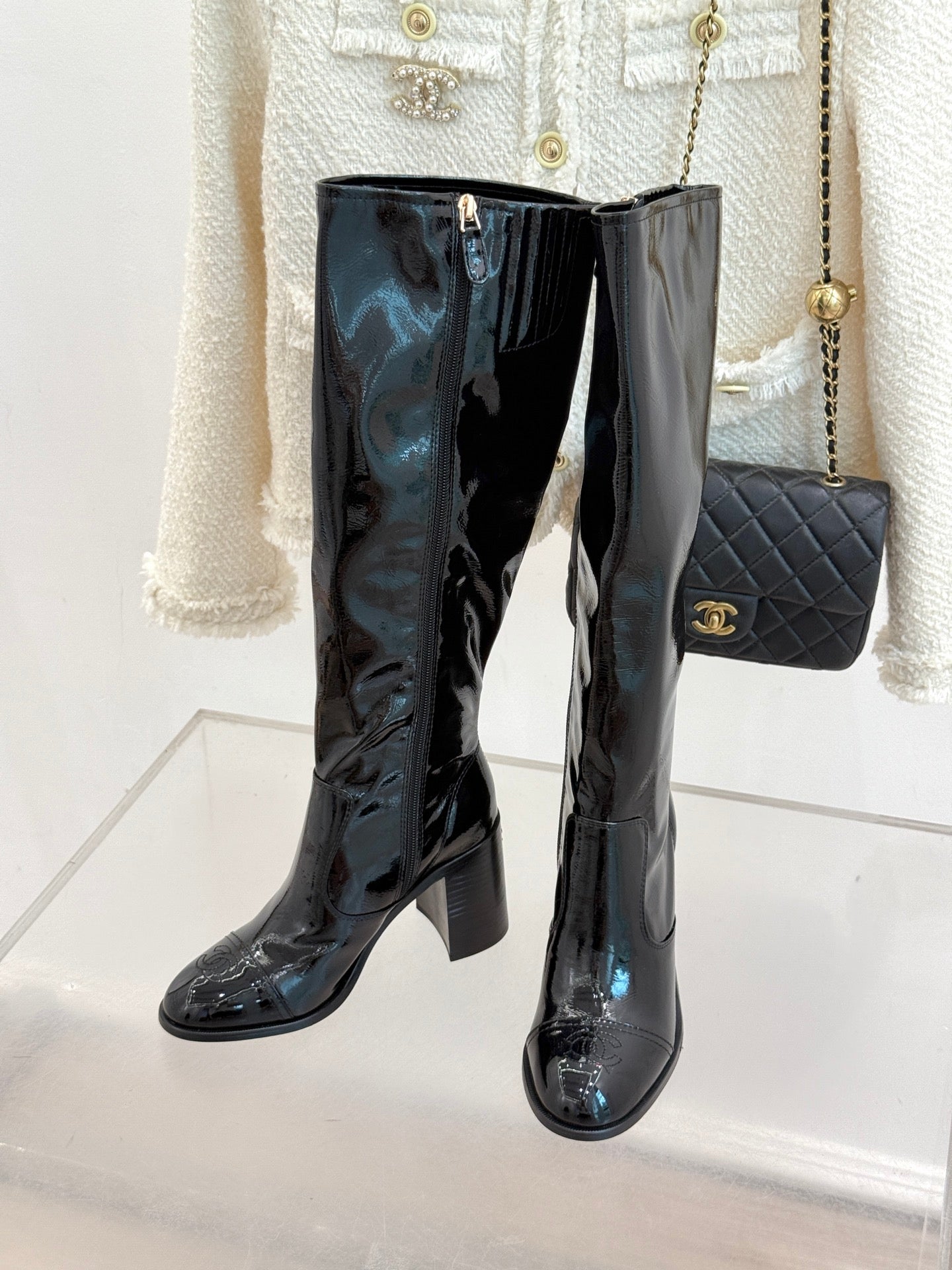 CC Classic Long Boots Block Heel 90mm Black Patent Leather 465395