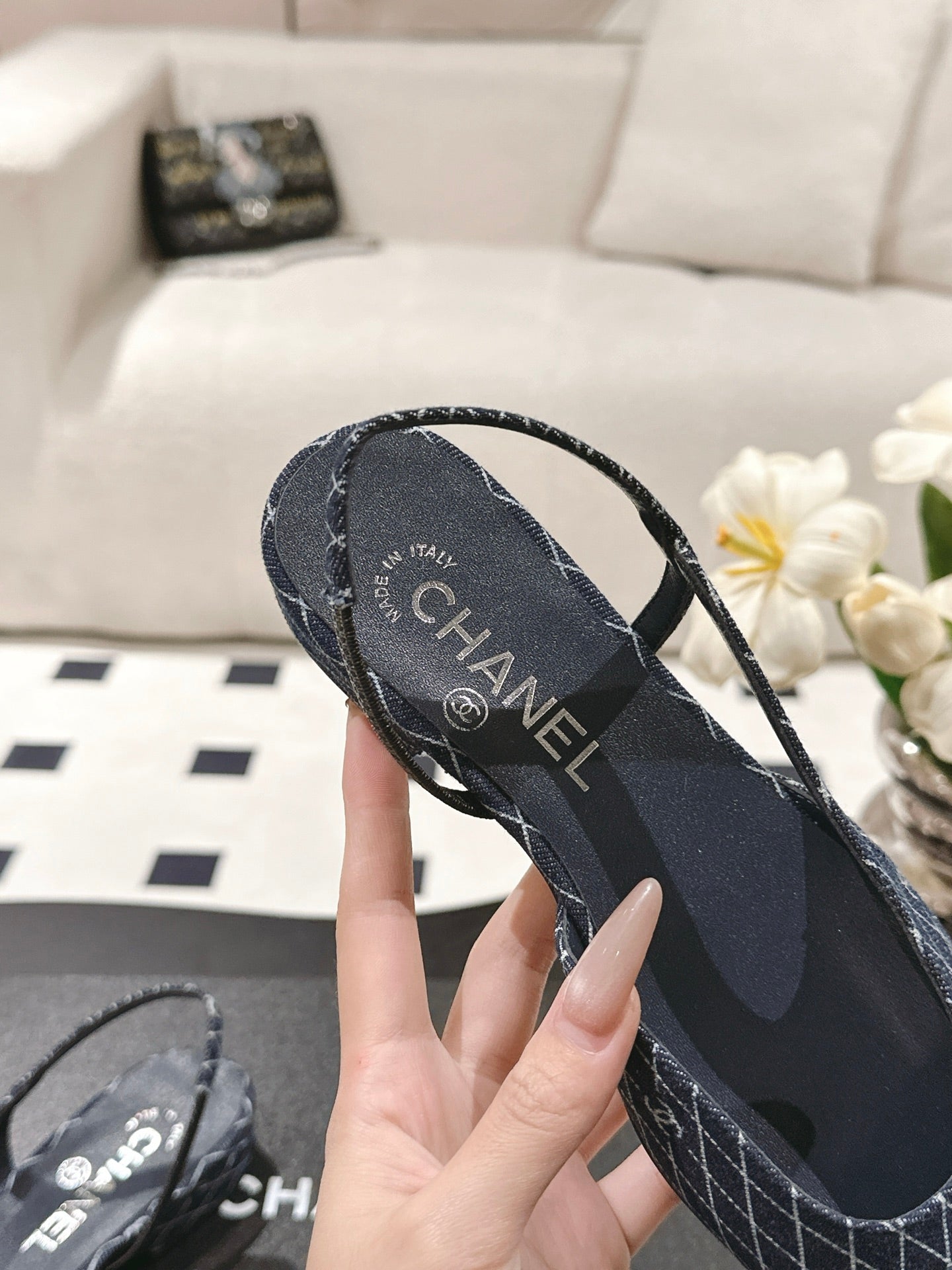 cc 2024k slingback 30mm dark blue suede black pattern calfskin 237501