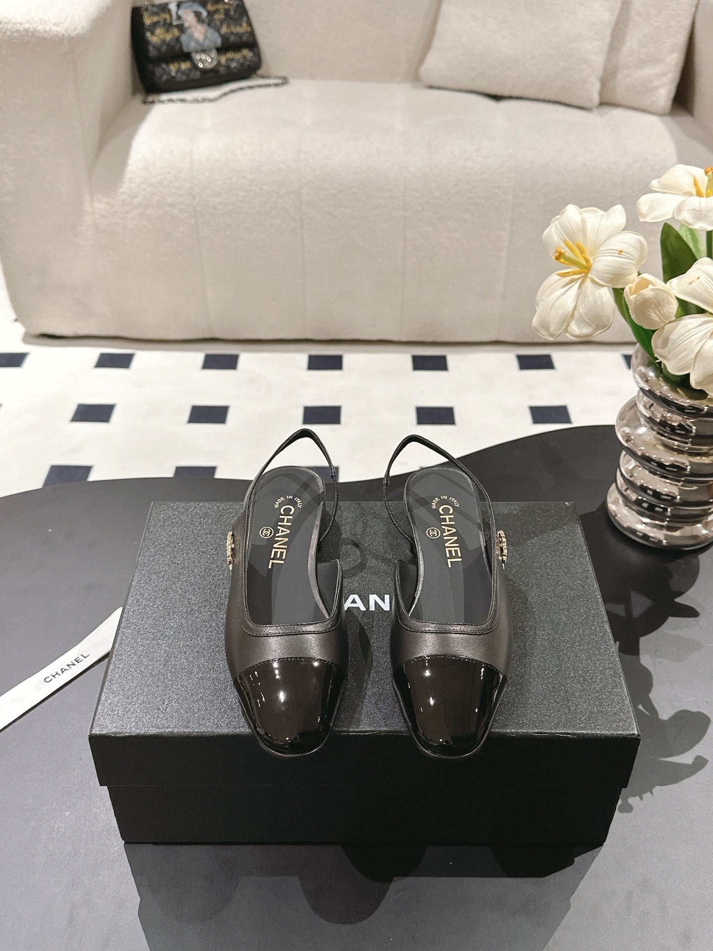 cc 25c slingback flat black white tweed black grosgrain 233608