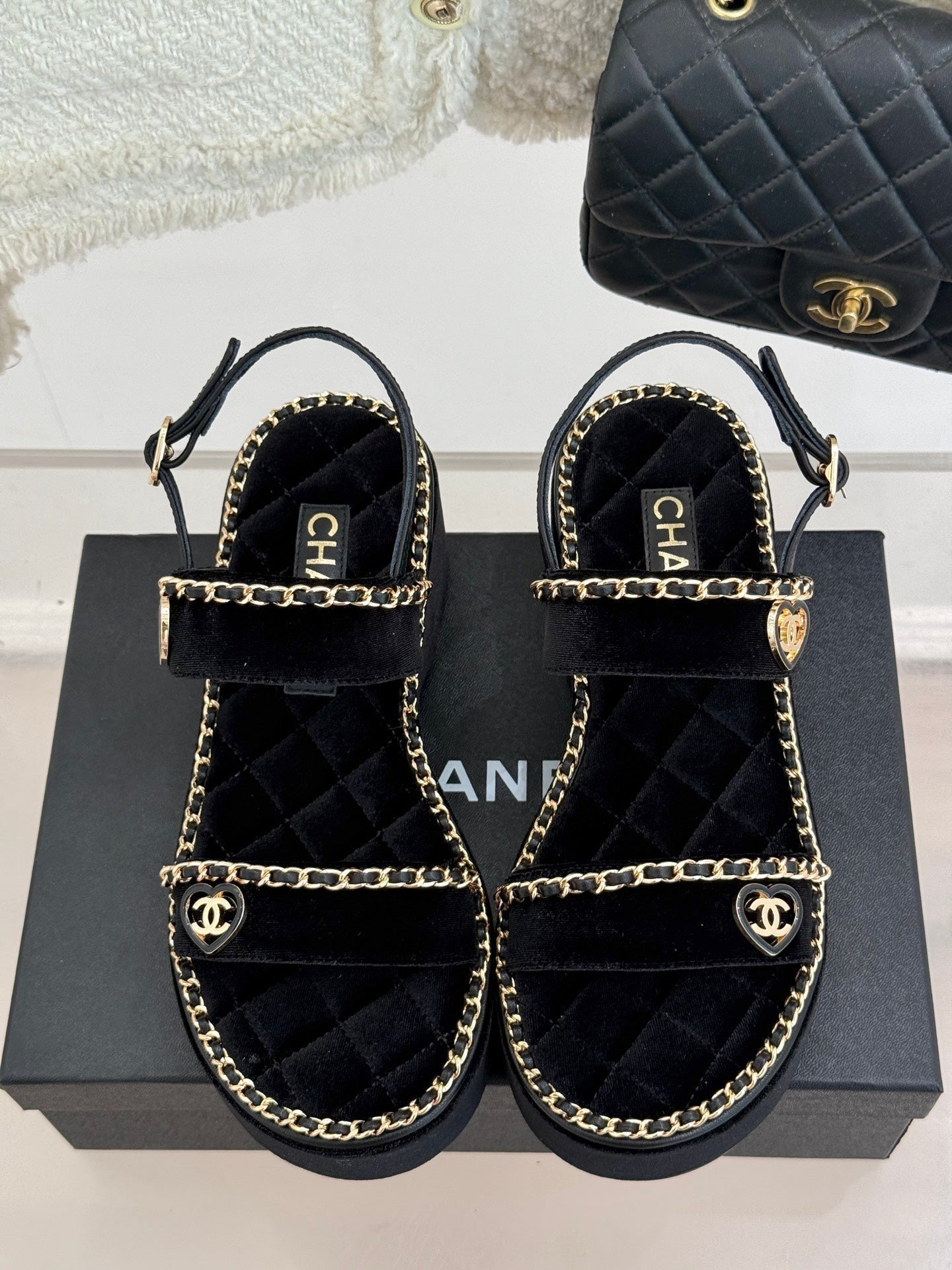 THICK-SOLED CHAIN HEART SANDAL IN BLACK VELVET