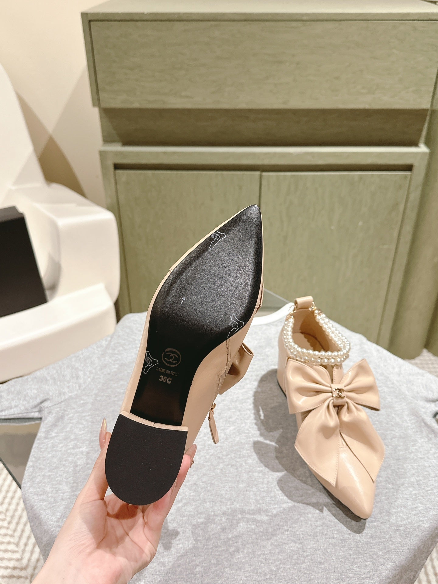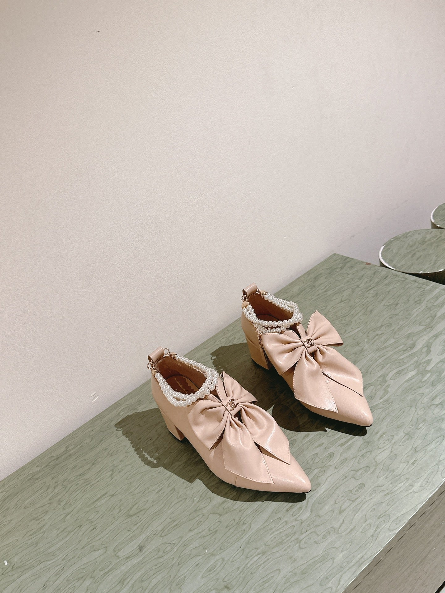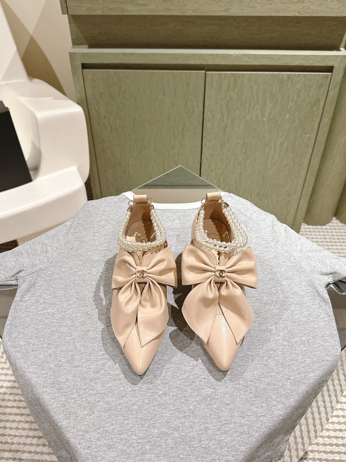CC 24A Pearl Bow Slingbacks 65mm Beige Sheepskin 447466