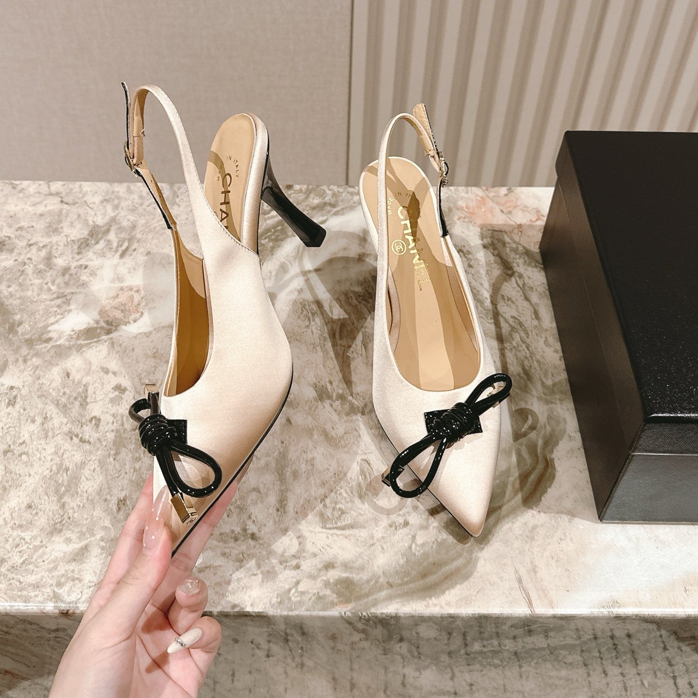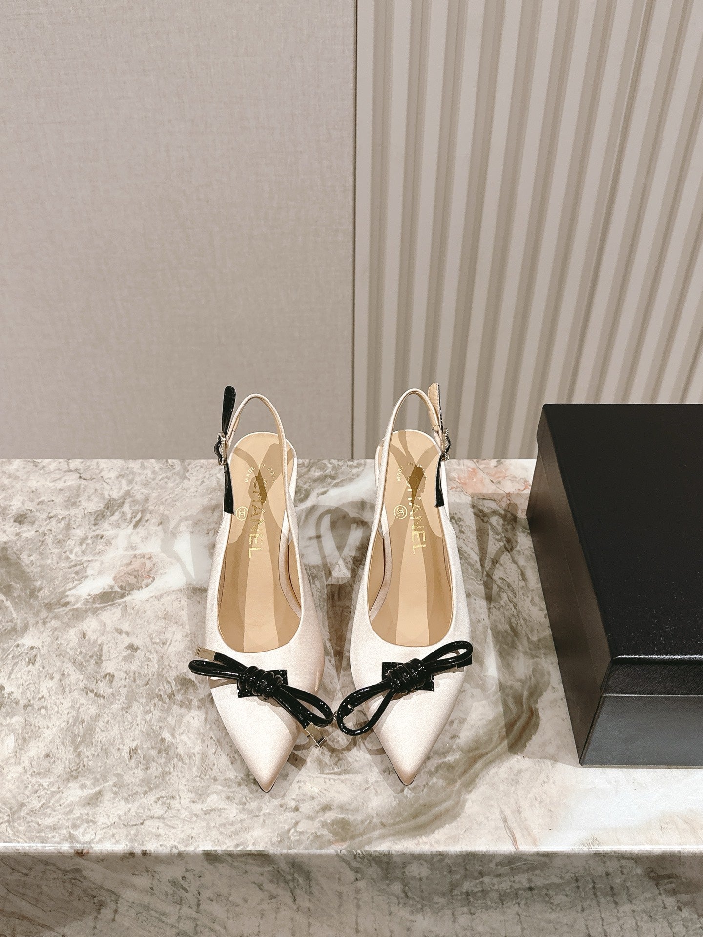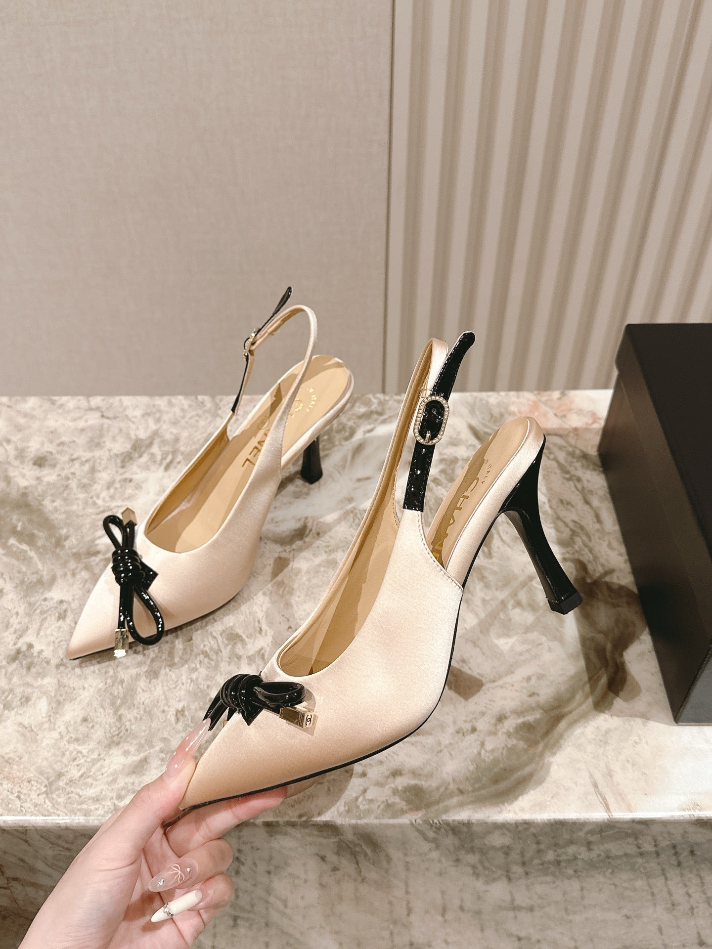 CC 25ss Bow Tie Slingbacks 85mm Beige Satin & Patent Leather 447413
