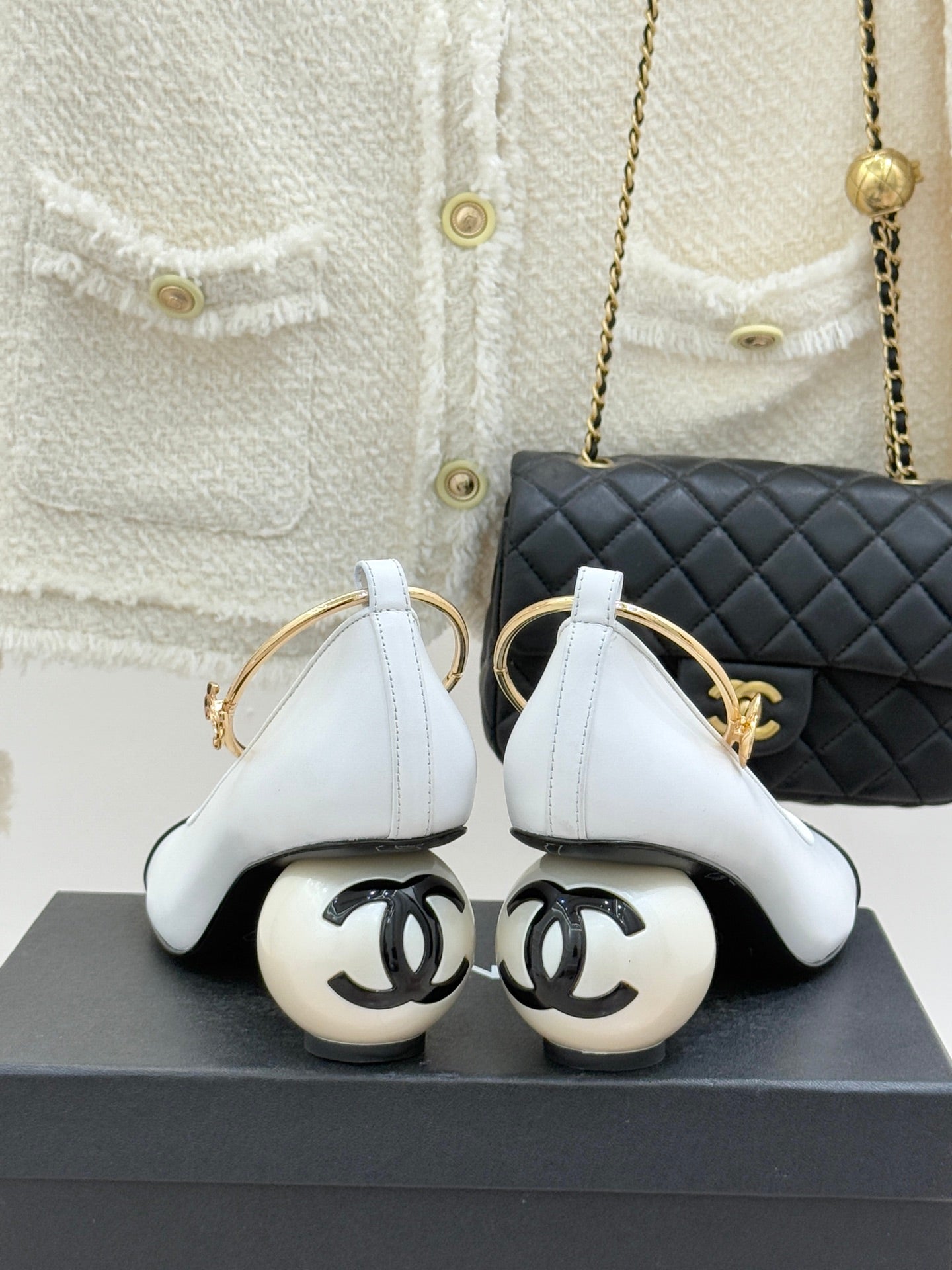 CC 26C Ribbon Camellia Mary Jane With Giant Pearl Black White Lambskin