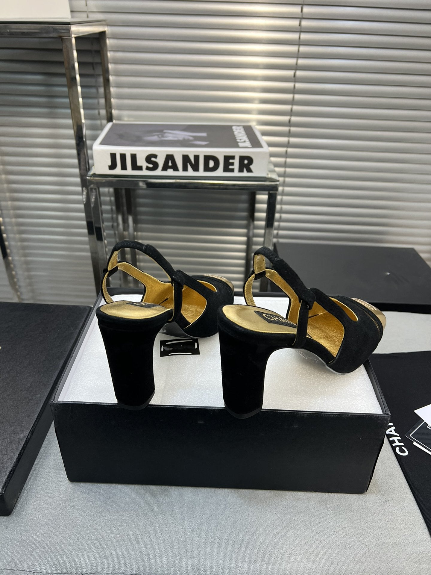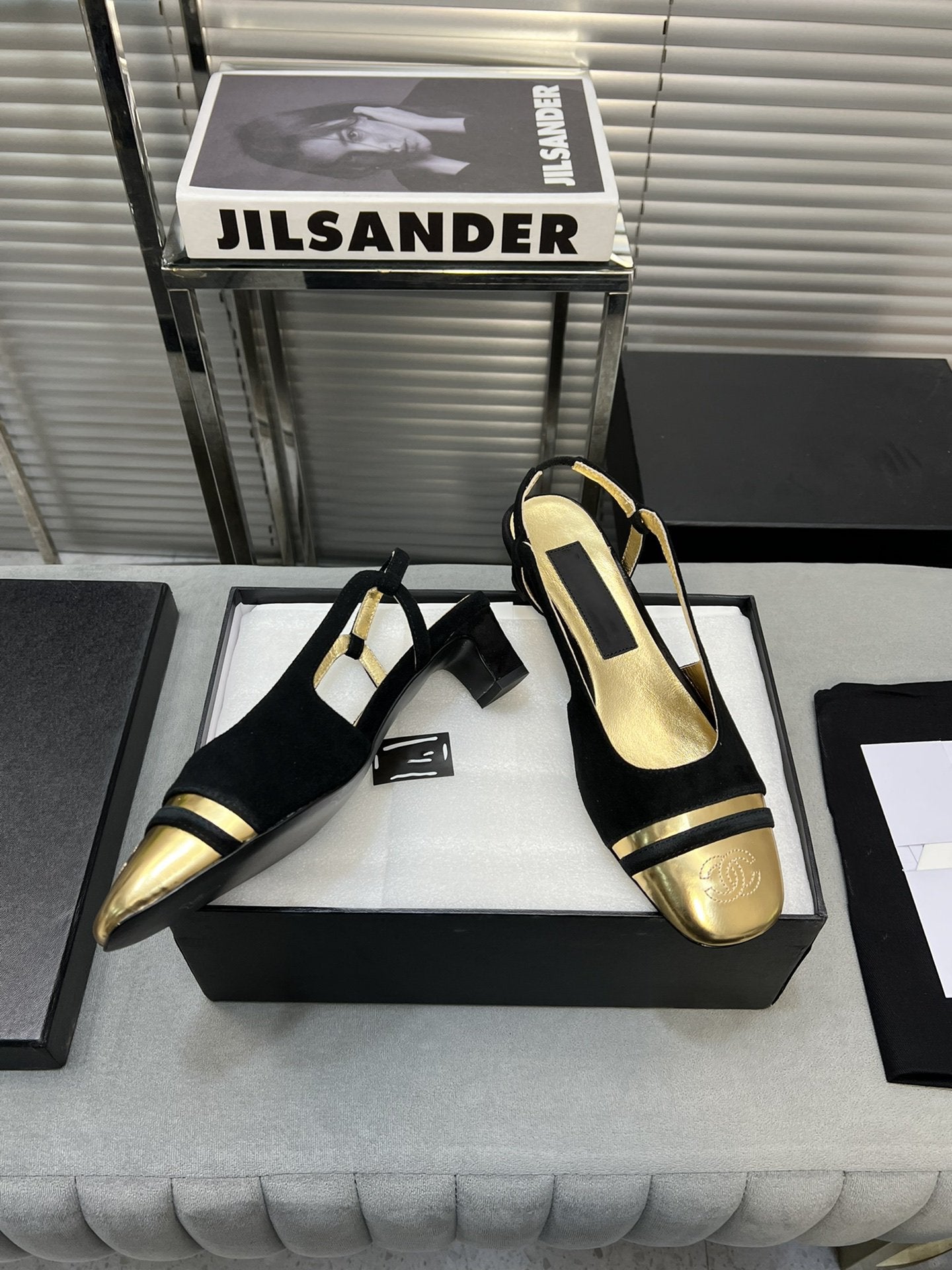 slingback black suede gold metalic lambskin square toe 5.0