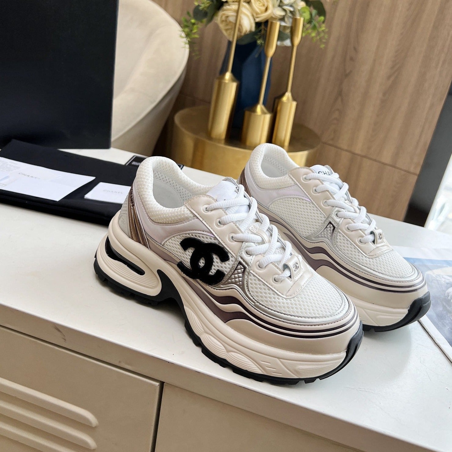 cc trainer black beige calfskin white mesh
