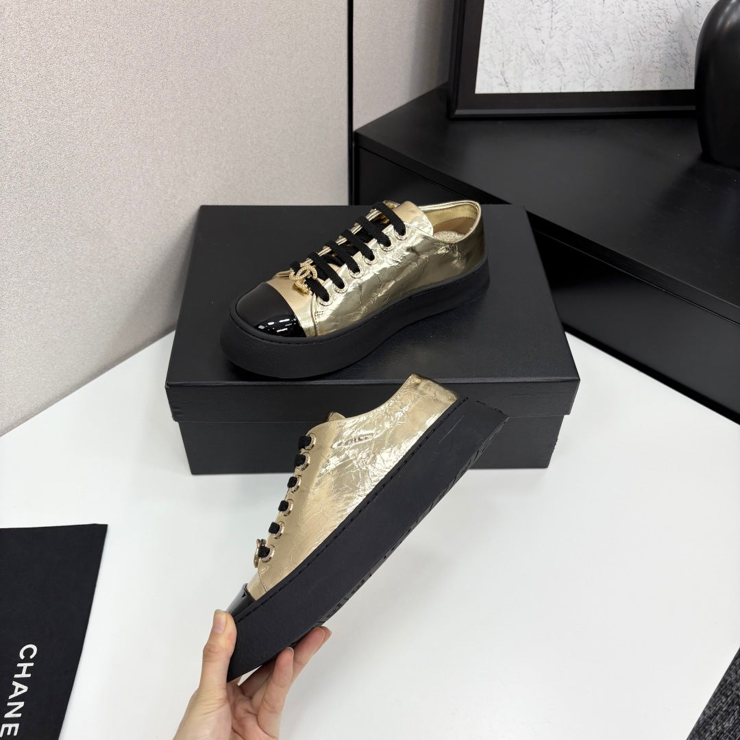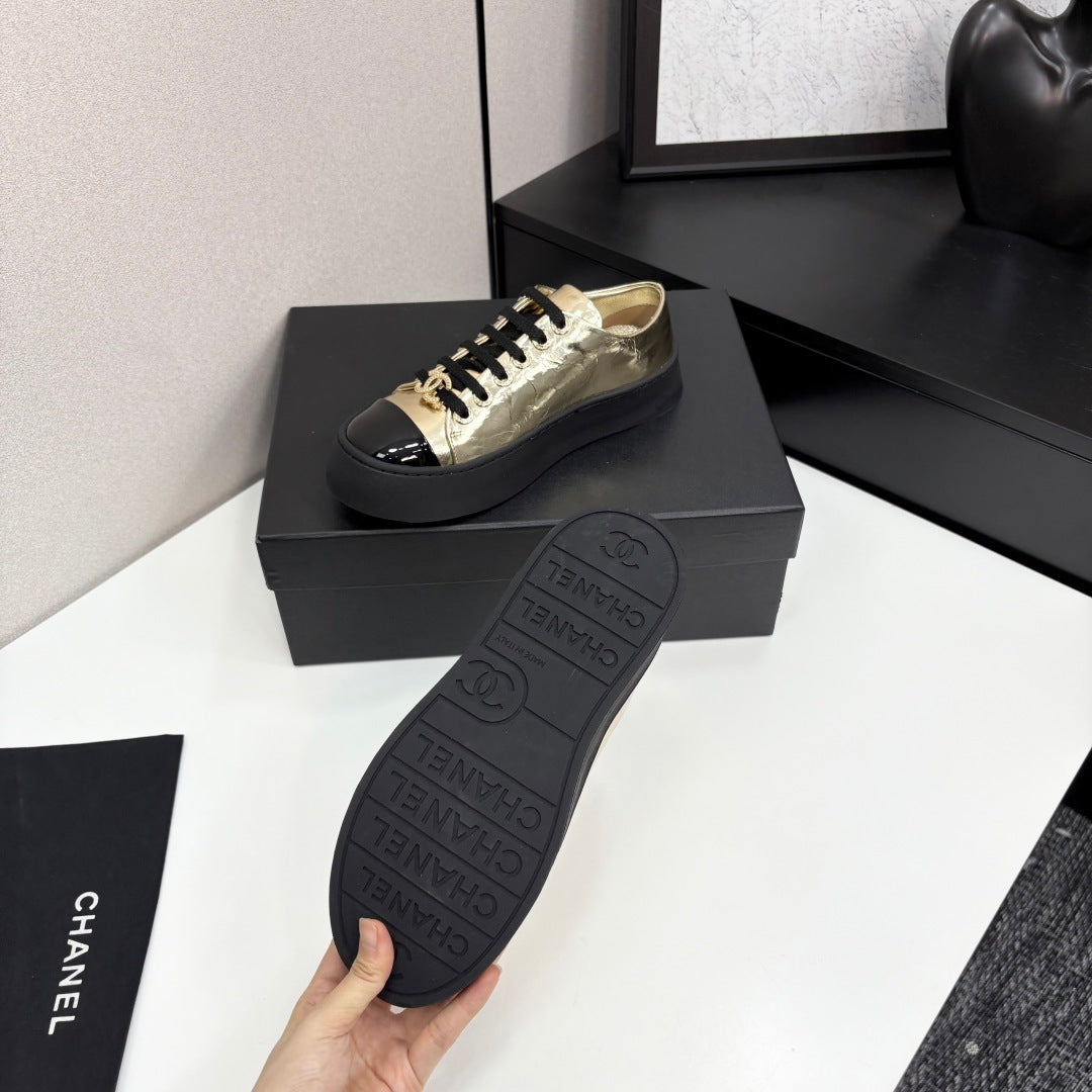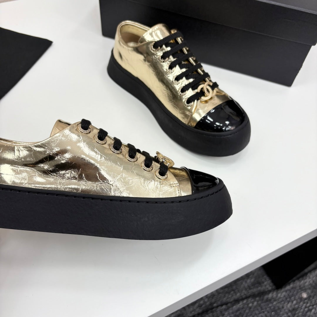 CC25 Lace-up Sneakers Gold Metallic Cowhide And Black Patent Leather 352500