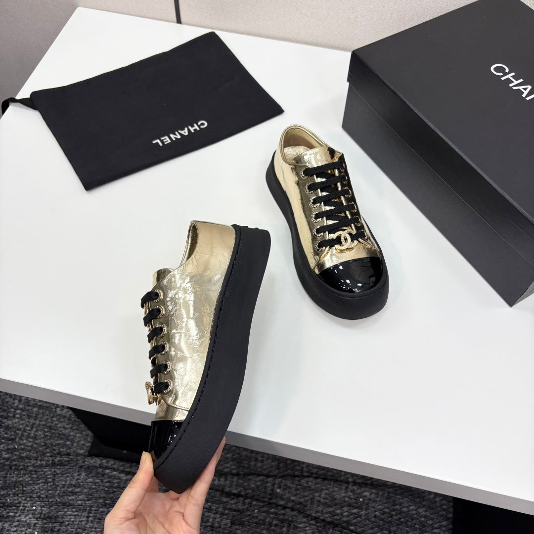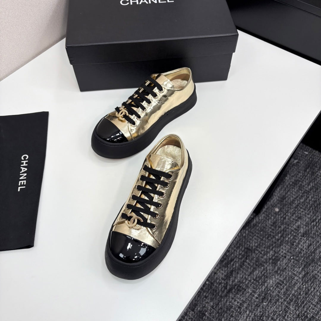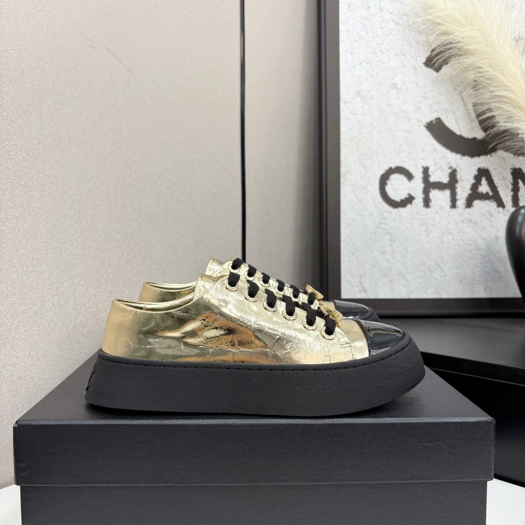 CC25 Lace-up Sneakers Gold Metallic Cowhide And Black Patent Leather 352500