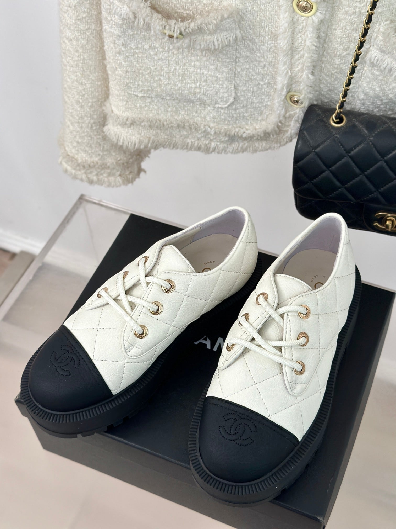 CC Low Sneaker 35mm White Tweed Fabric And Lambskin