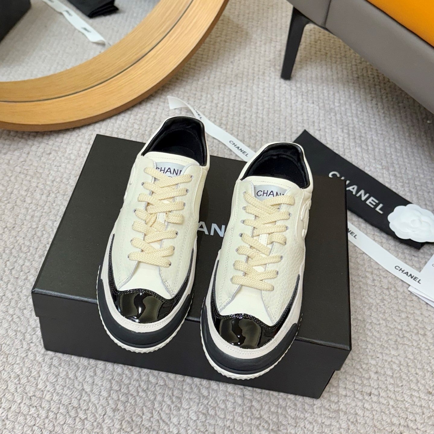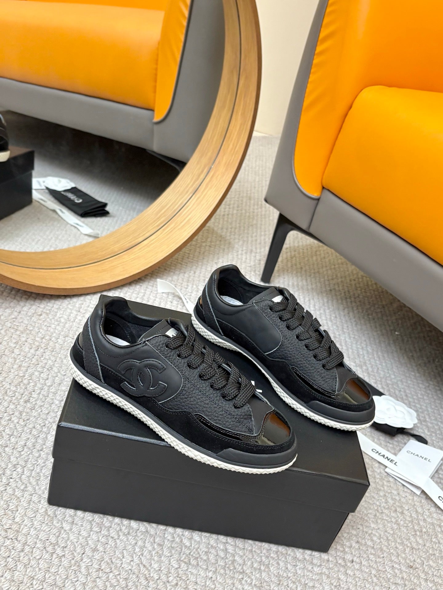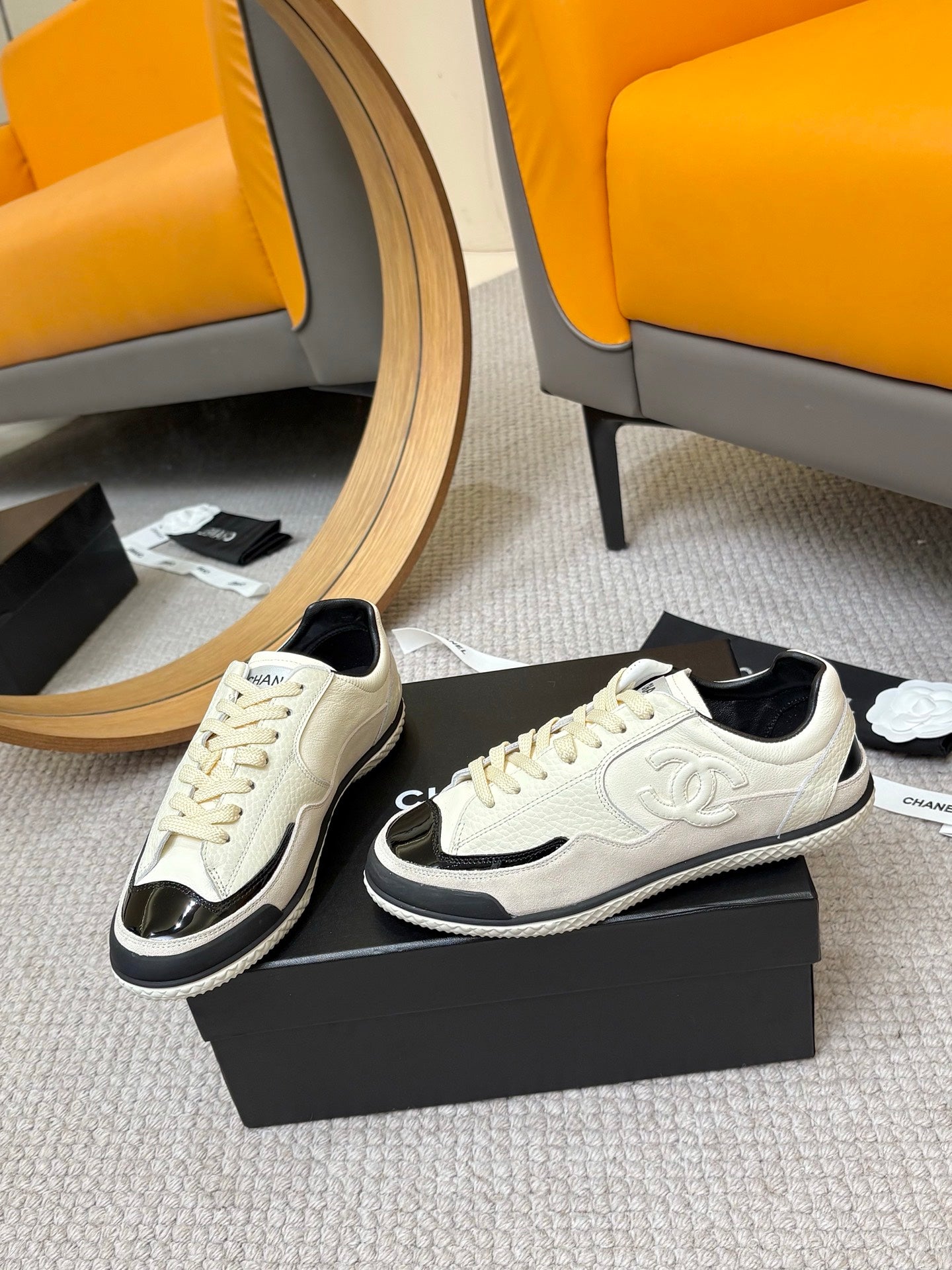 CC 25C Casual Sneakers Cream Black Cowhide Suede Patent Leather 528157