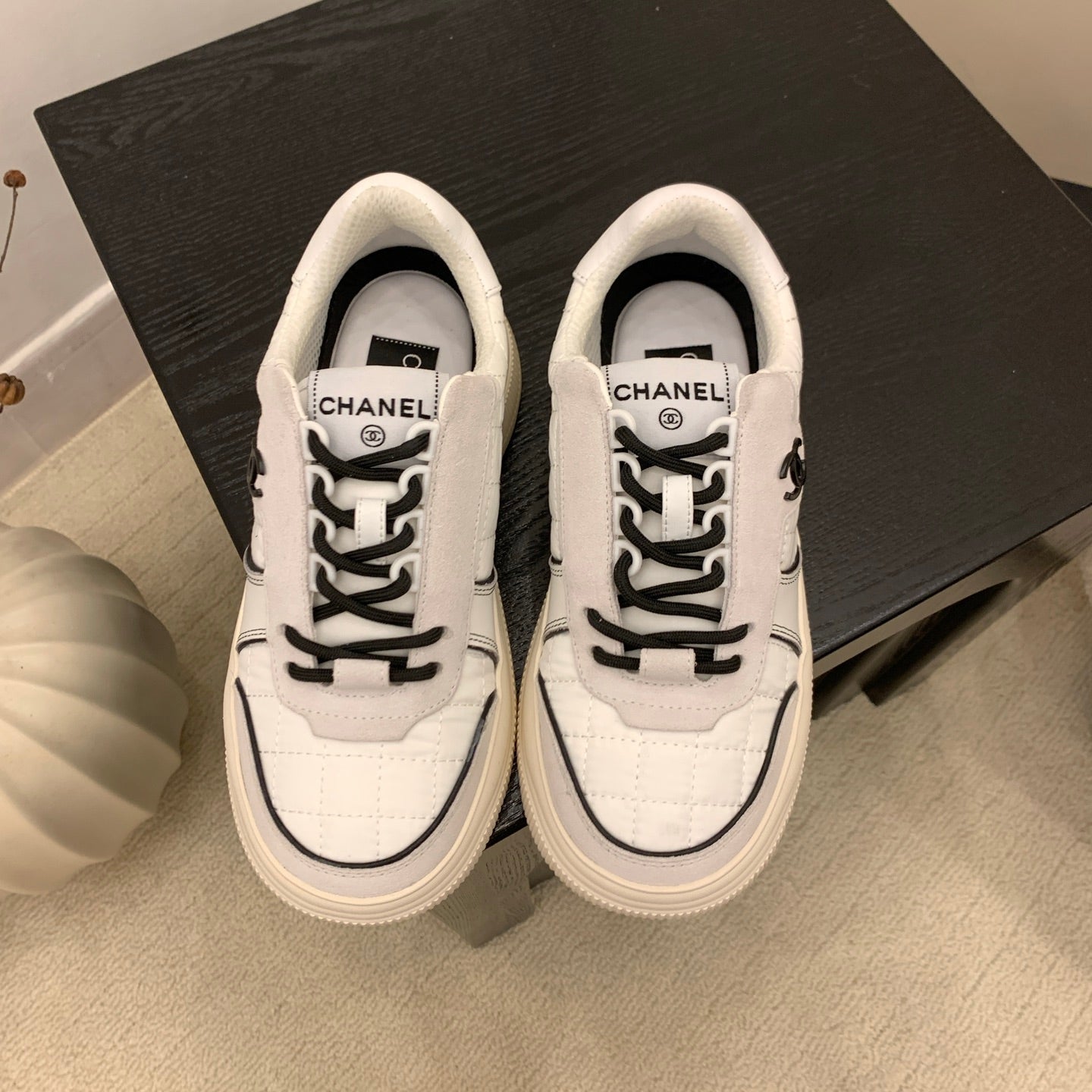 Chanel 2025 Quilted High-Top Sneakers White Black Cowhide 469790