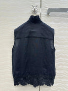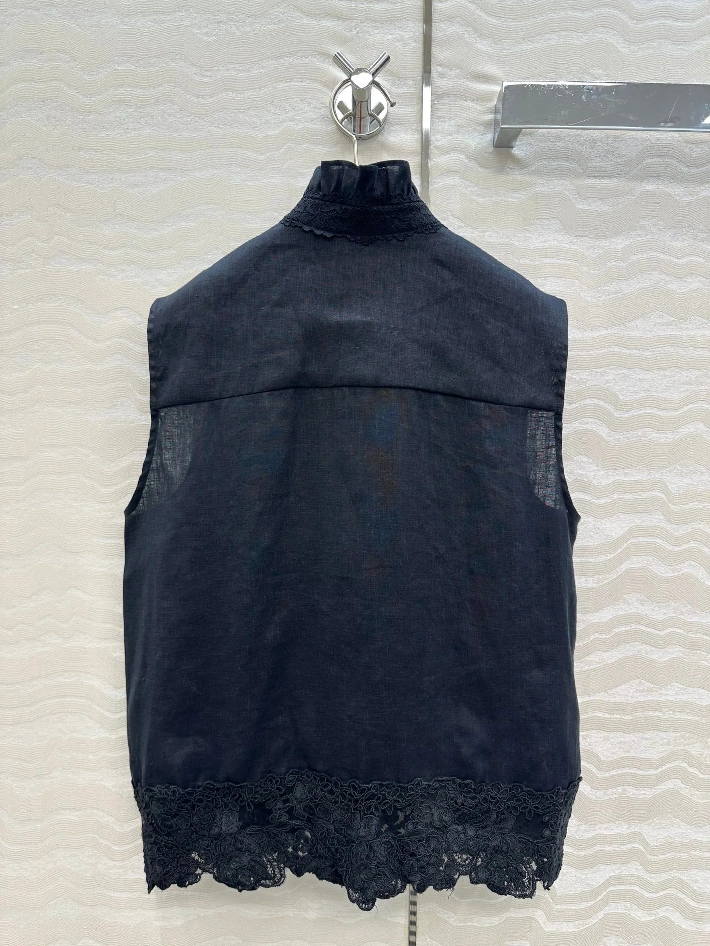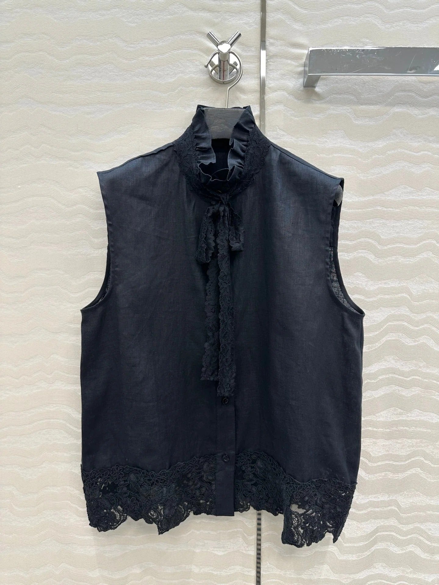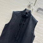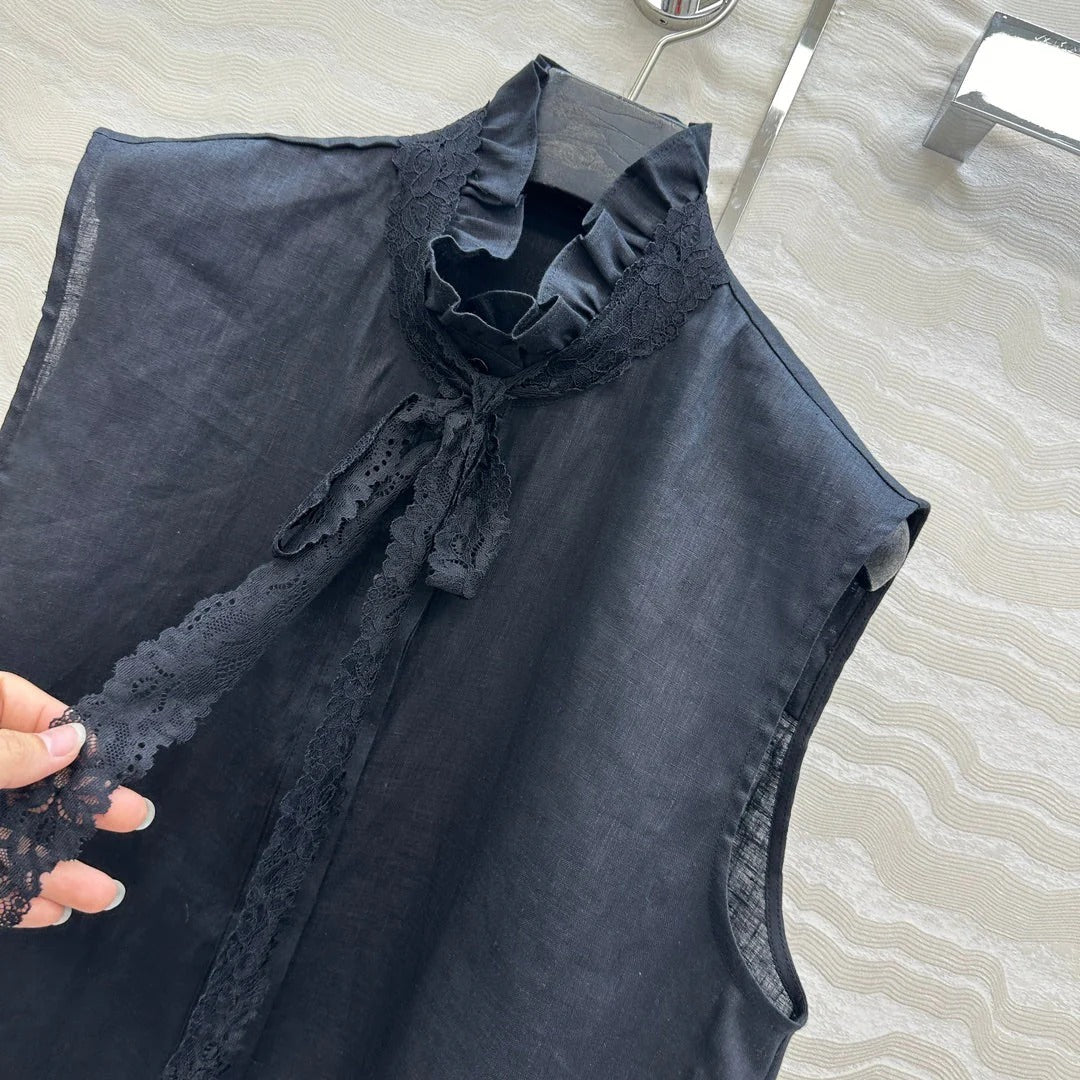 SLEEVELESS BLOUSE IN BLACK LINEN LACE TRIM AND NECK TIE