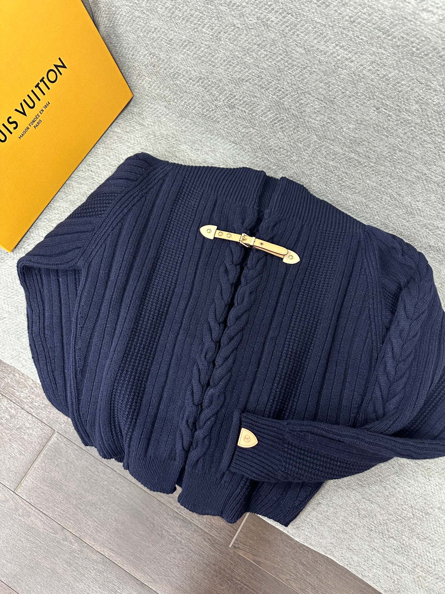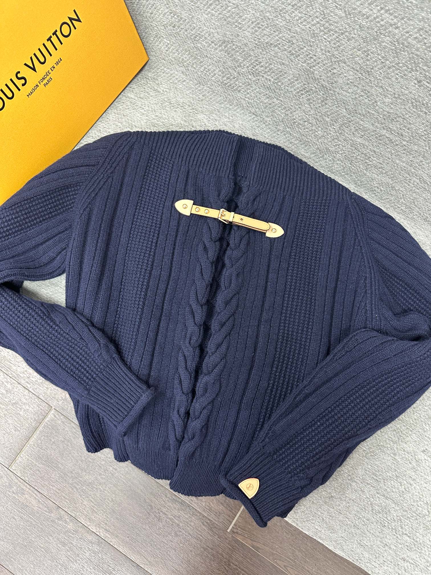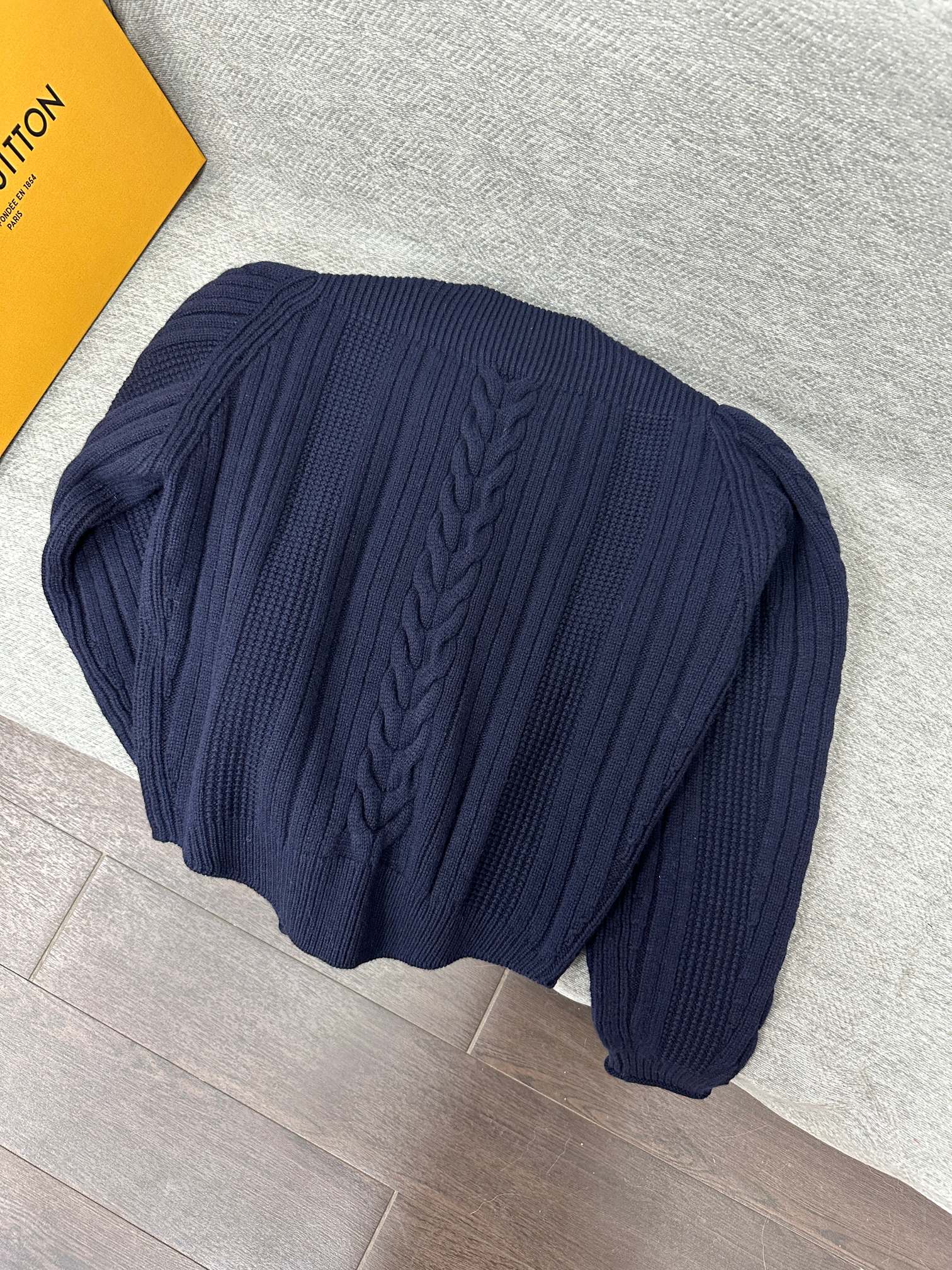 LV Strap Front Cable-Knit Cardigan Dark Blue Wool 349453