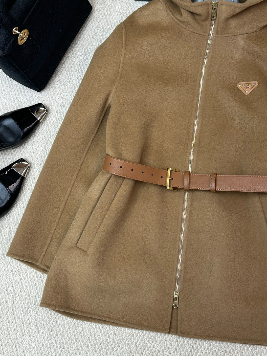 Prada 25 Mid-length Hooded Coat Camel Brown Wool 637354