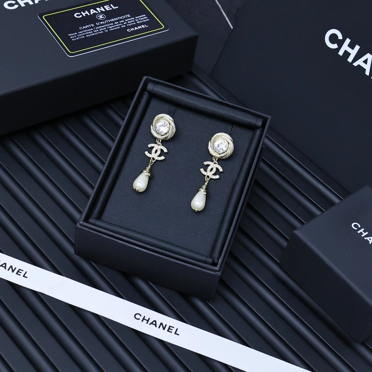 25S TWISTED RIBBED DOUBLE C IN GOLD METAL LONG PEARL PENDANT EARRINGS