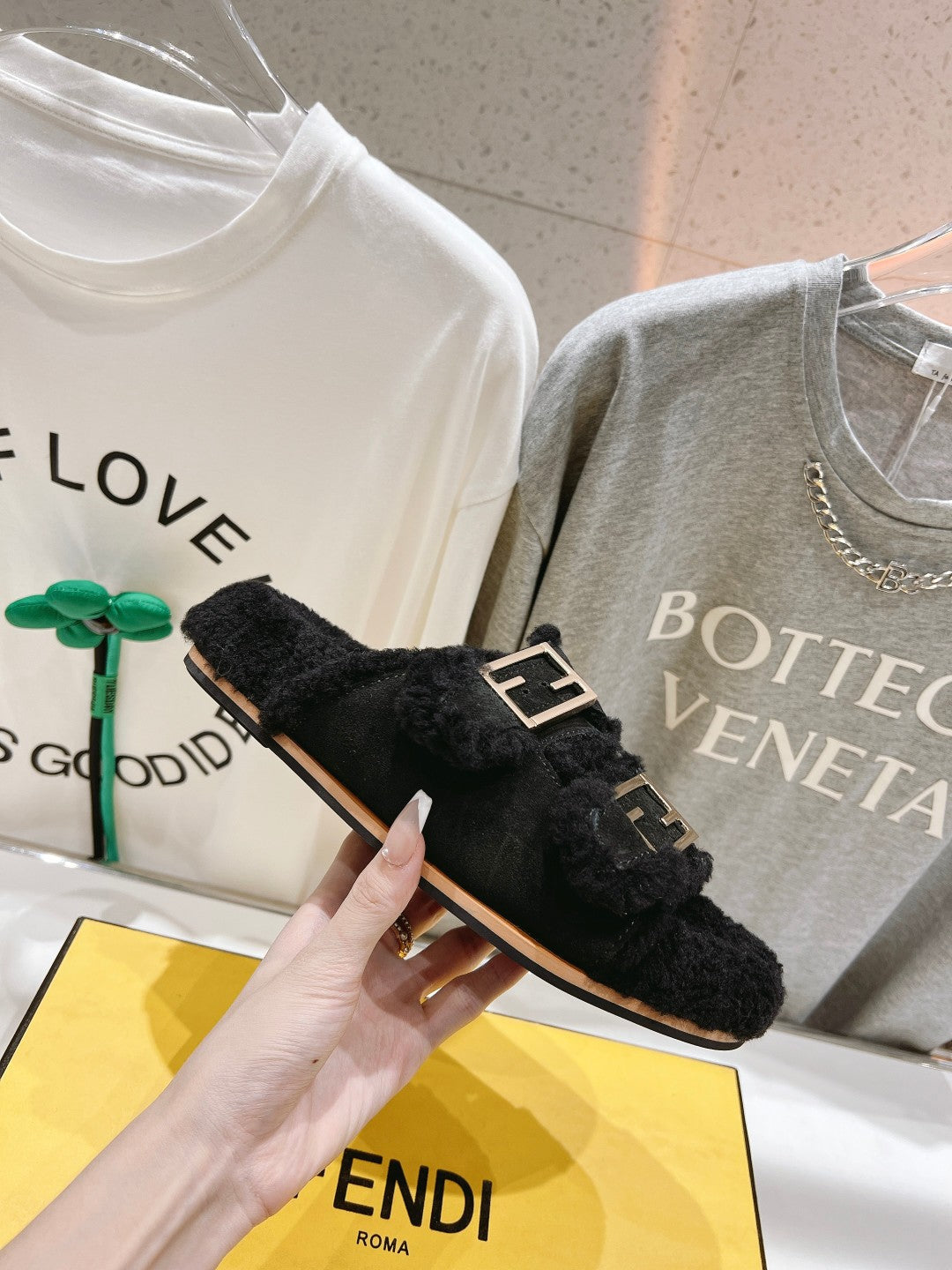 FENDI DAD SANDAL MULE IN BLACK SUEDE WITH FLEECE WITH GOLD HARDWARE