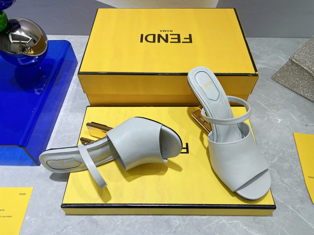 FENDI FIRST 95 MM HIGH-HEELED SANDAL IN CLOUD GREY LAMBSKIN GOLD HARDWARE