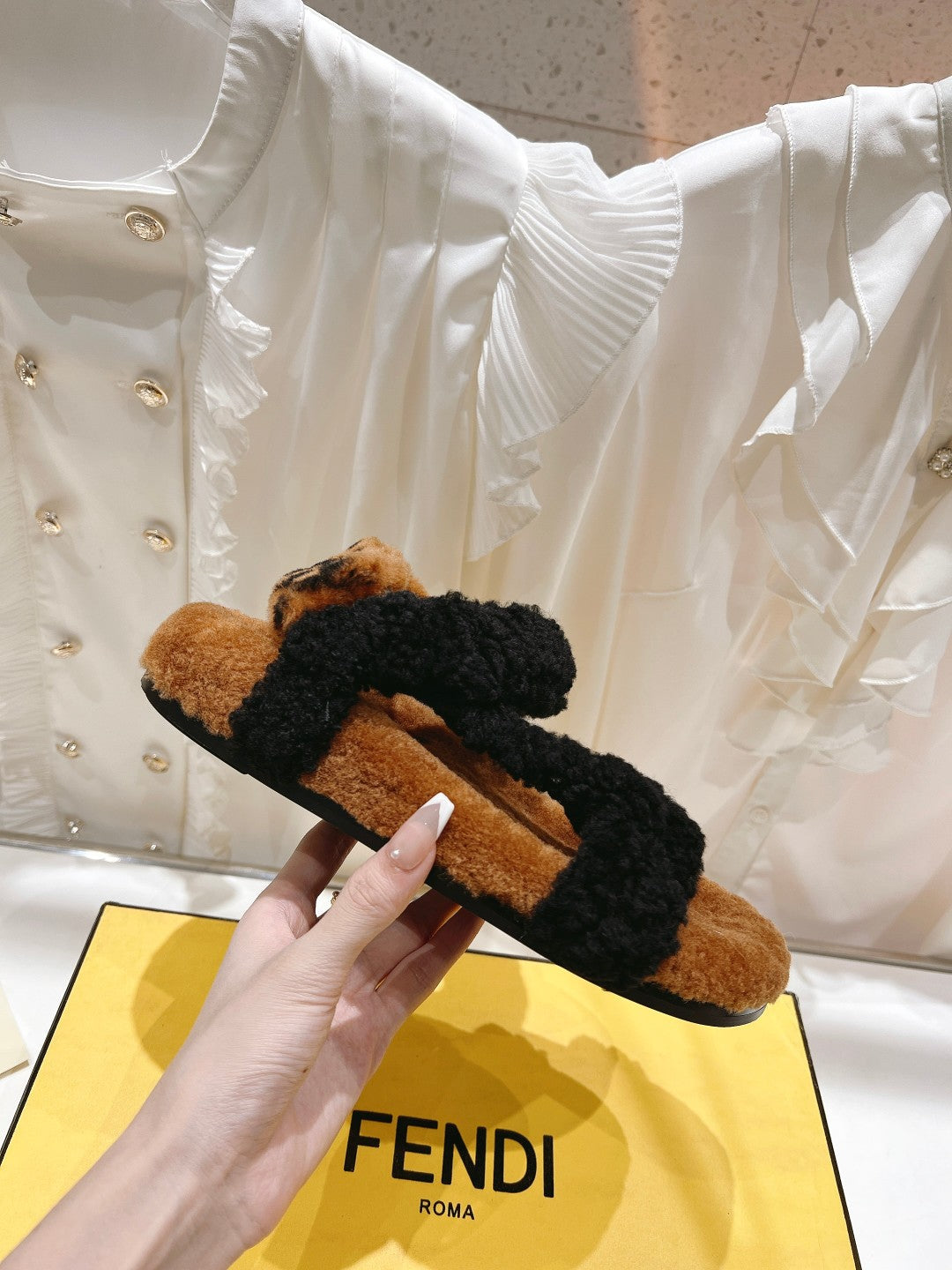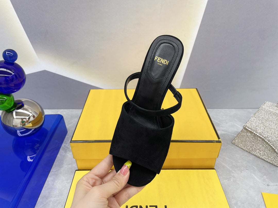 FENDI DAD SANDAL MULE IN BLACK SUEDE WITH FLEECE WITH GOLD HARDWARE