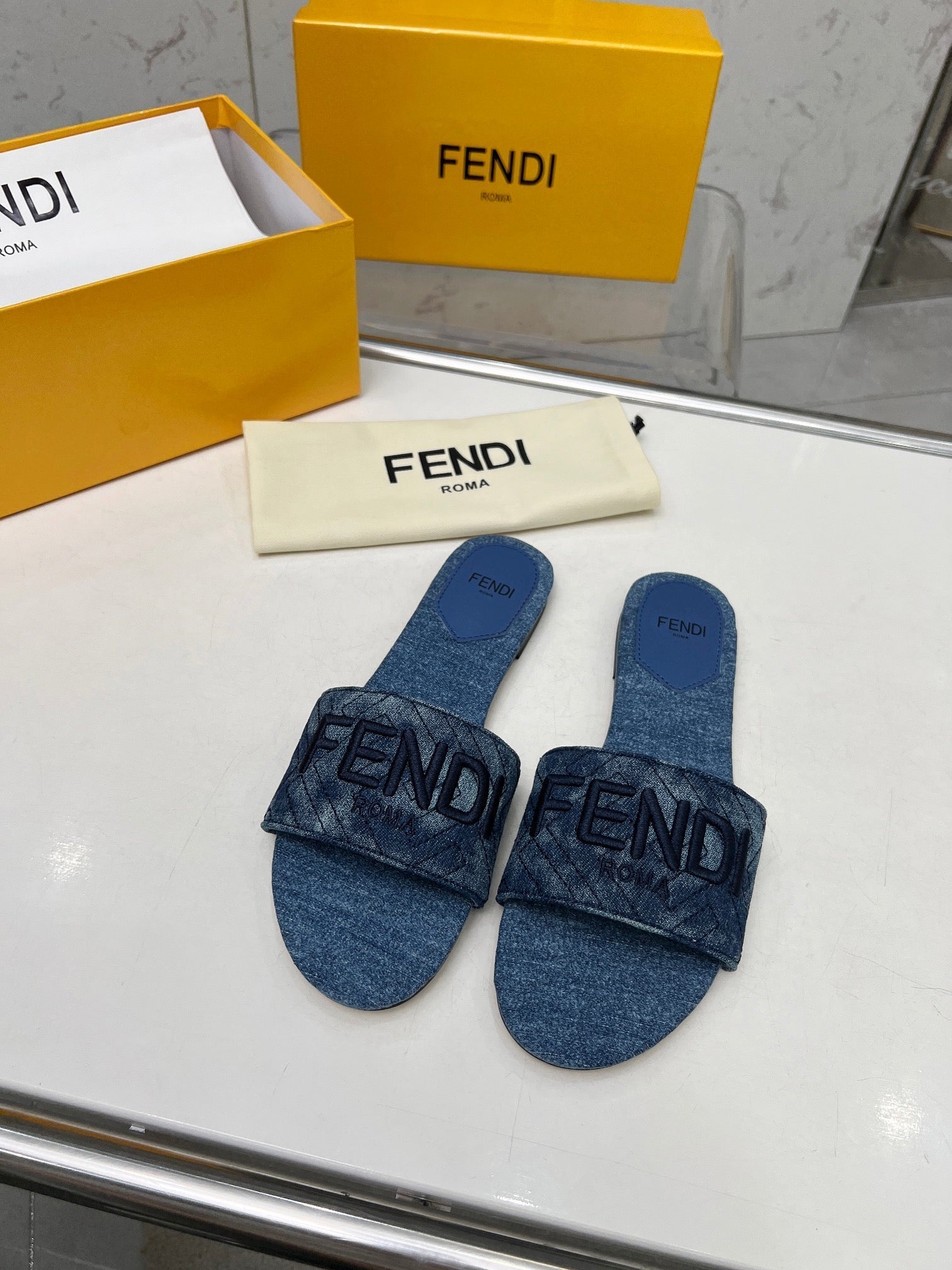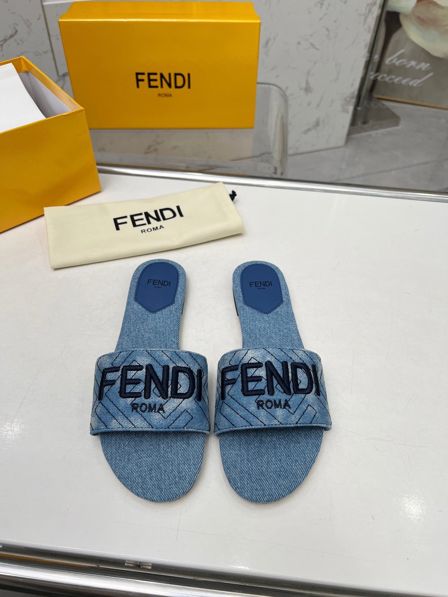 FENDI FLORAL SLIDES IN BLUE MIX WHITE FABRIC