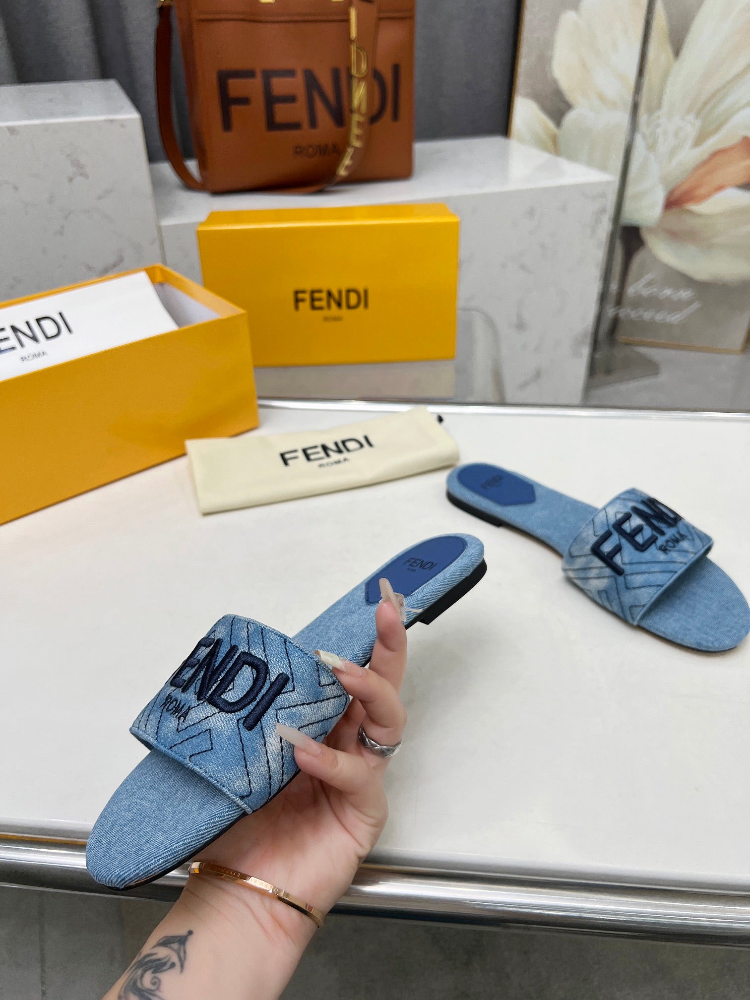 FENDI BAGUETTE SIGNATURE SLIDE IN LIGHT BLUE DENIM AND BROWN CALFSKIN