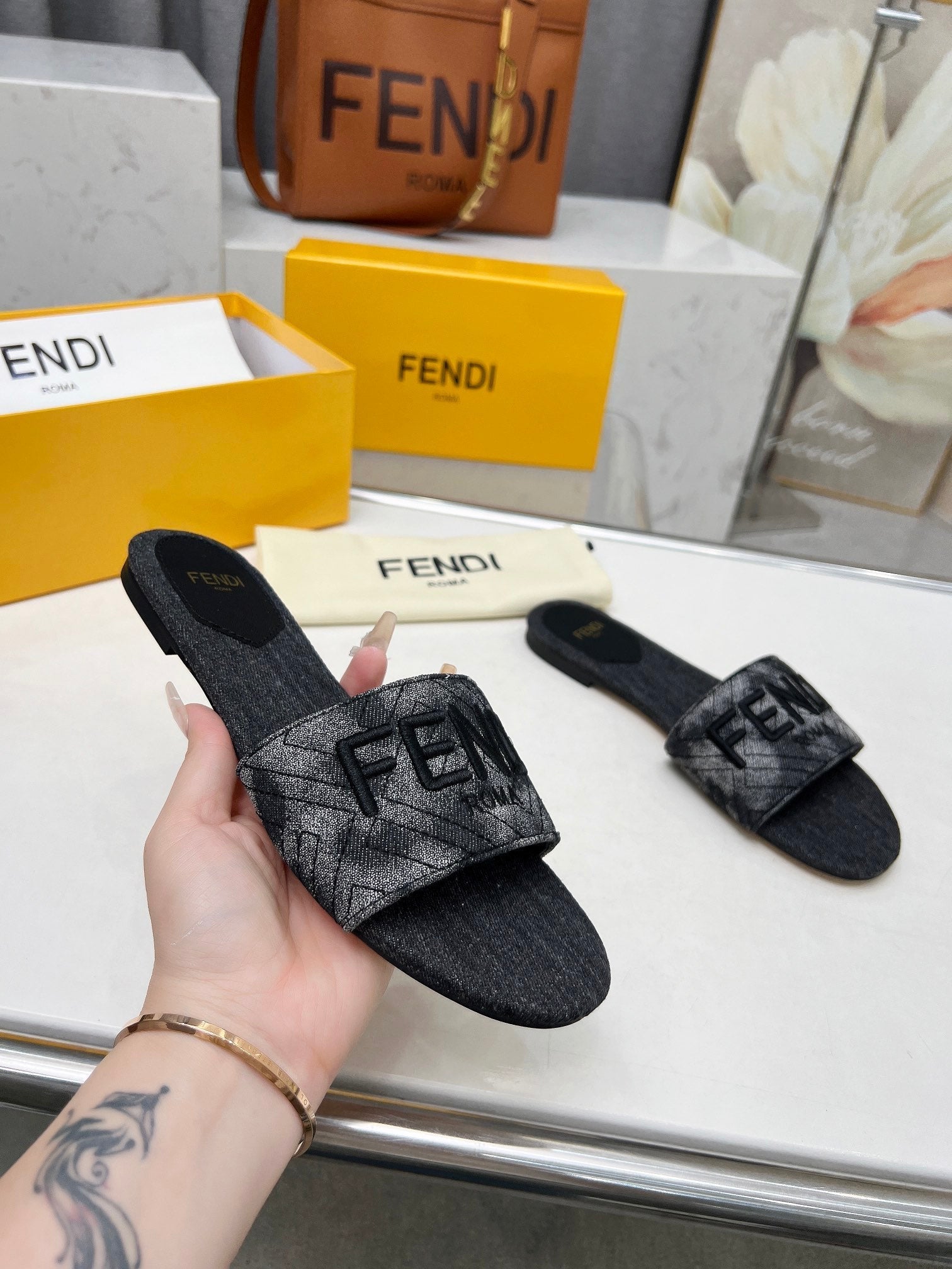FENDI FLORAL SLIDES IN BLACK MIX WHITE FABRIC