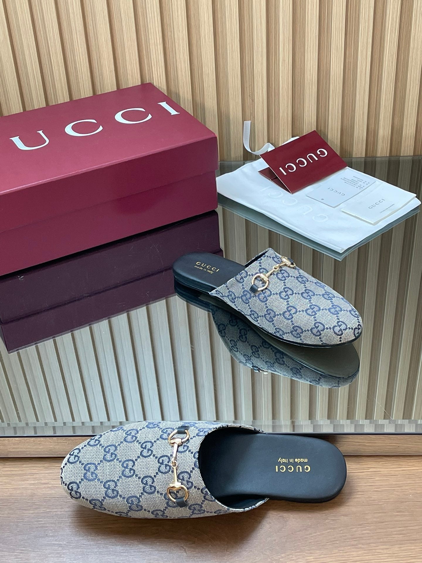 GG horsebit flat mules black suede and wool 534710