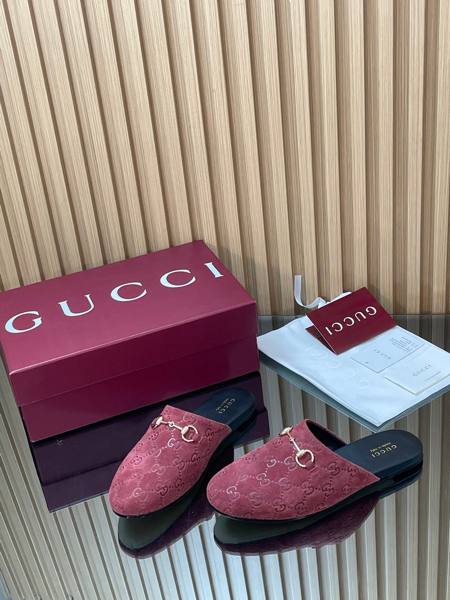 GG Horsebit Embossed Mule Red Suede And Wool 536051