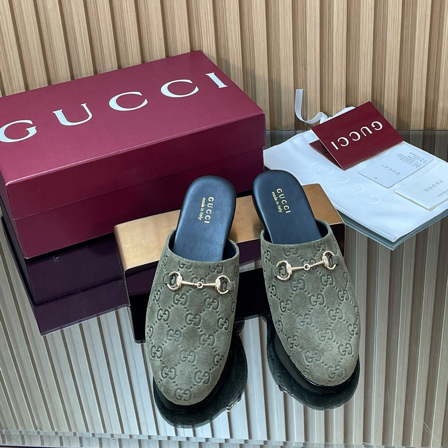 GG horsebit flat mules olive green suede and wool 534707