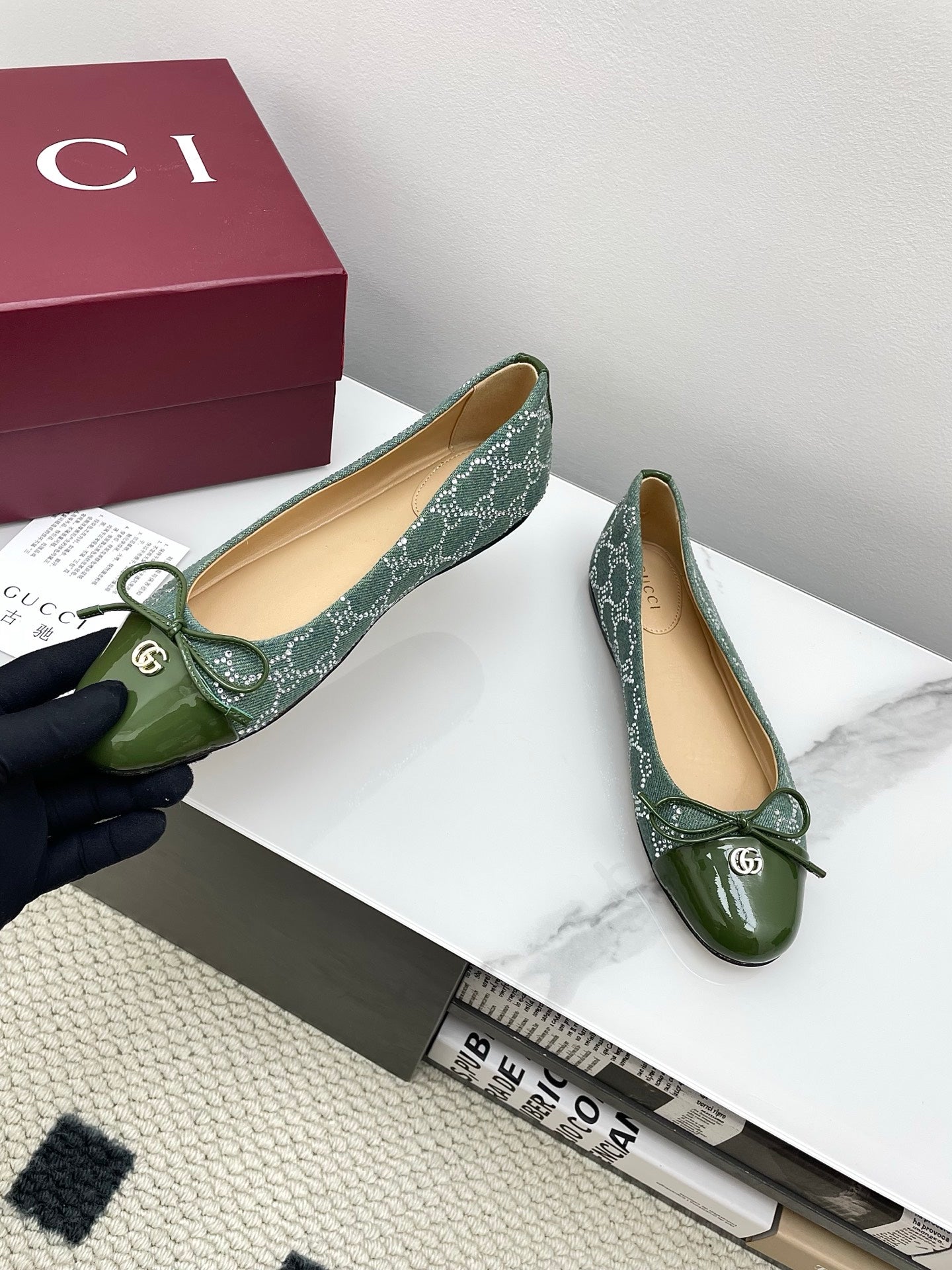 GG Women's Crystal Ballet Flat Dark Green Denim Patent Leather Trim 511495