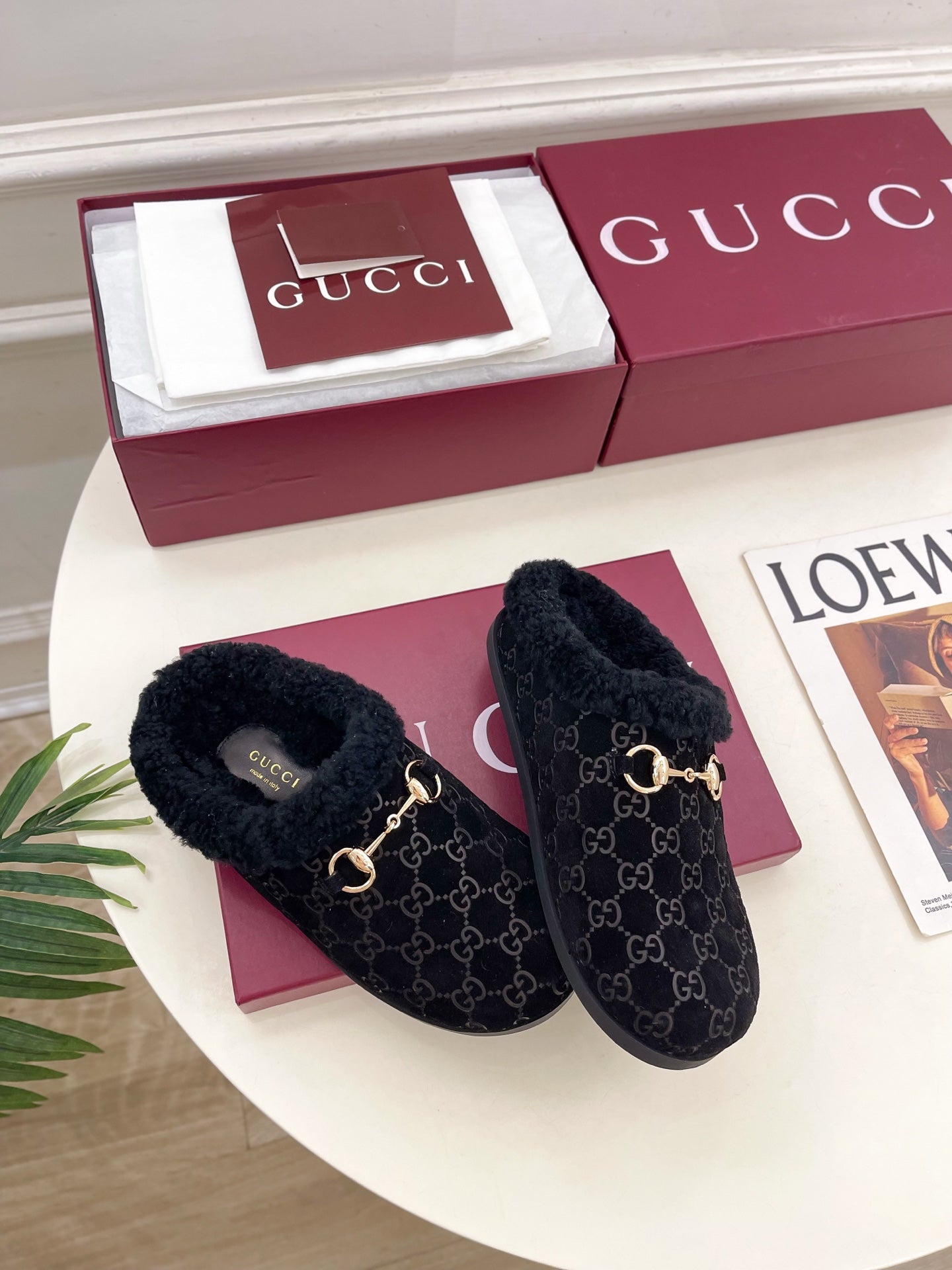 GG Horsebit Embossed Mule Black Suede And Wool 536050