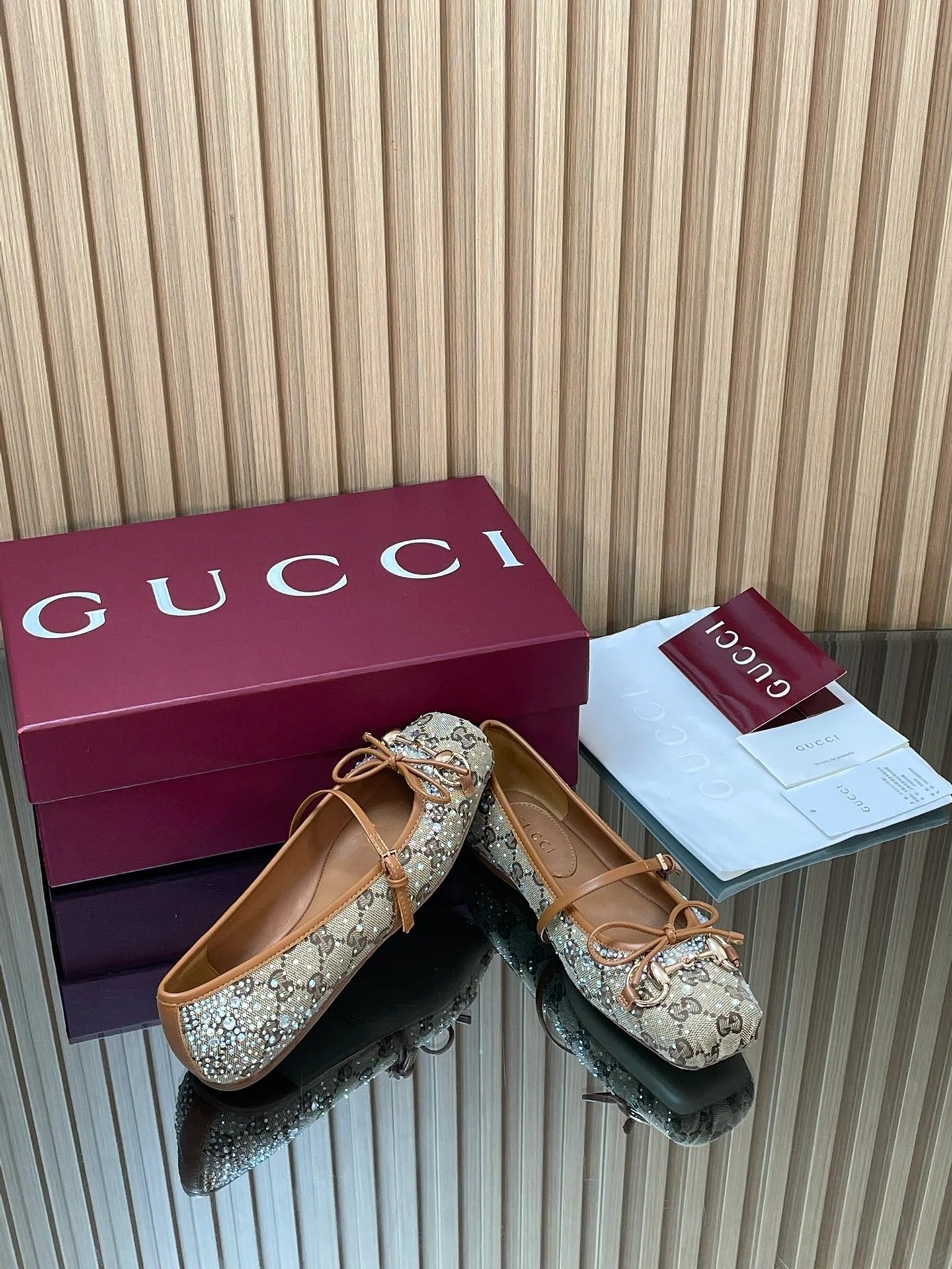 Gucci 2026 Crystal Rhinestone Ballet Flat Beige Brown Canvas Leather 562909