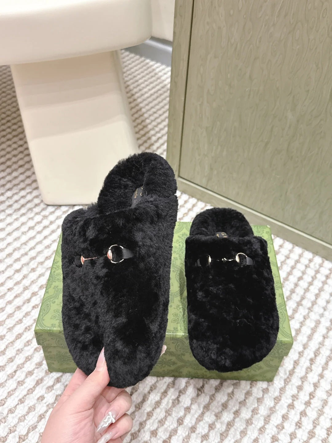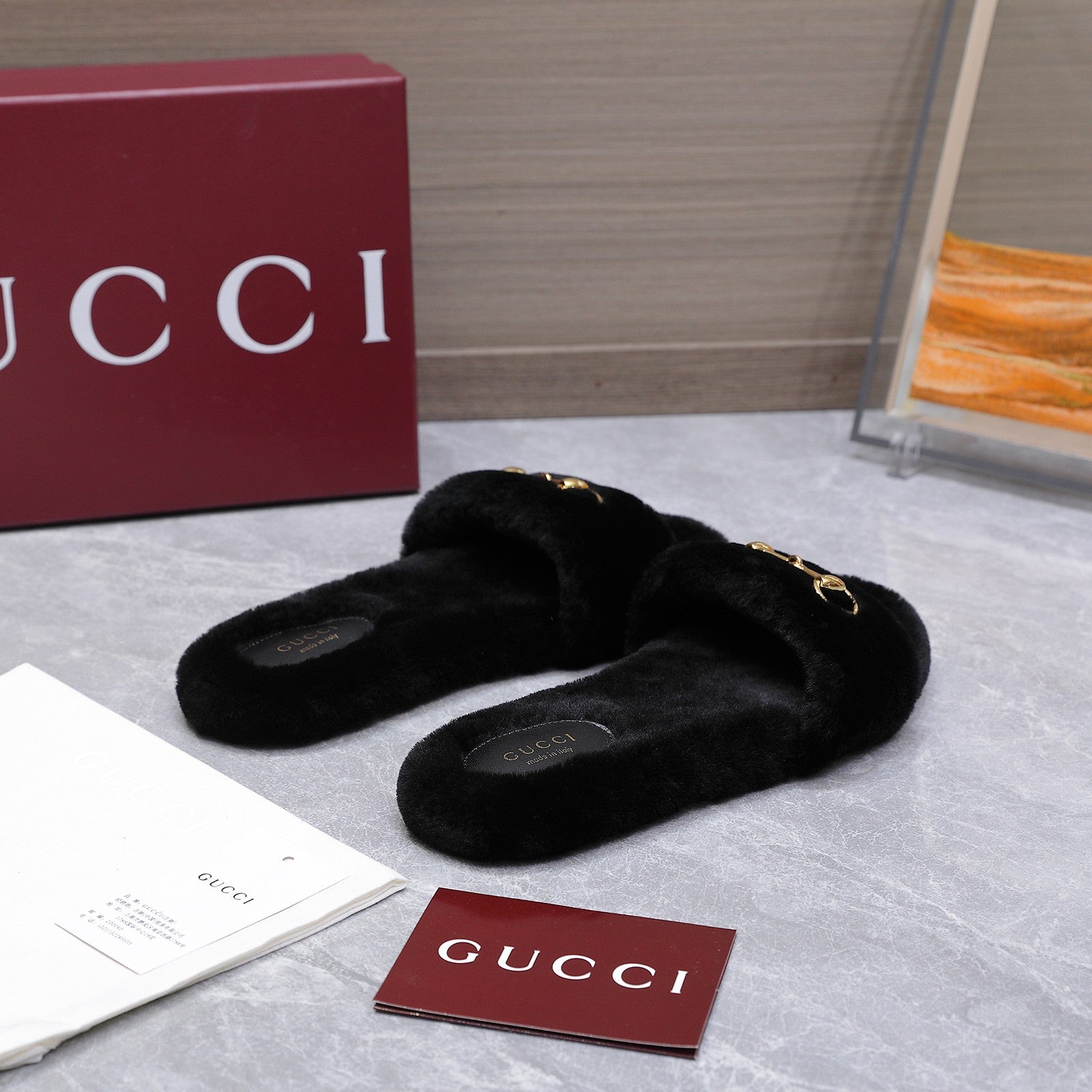 GG Women's Slide with Horsebit Black Fur 600973
