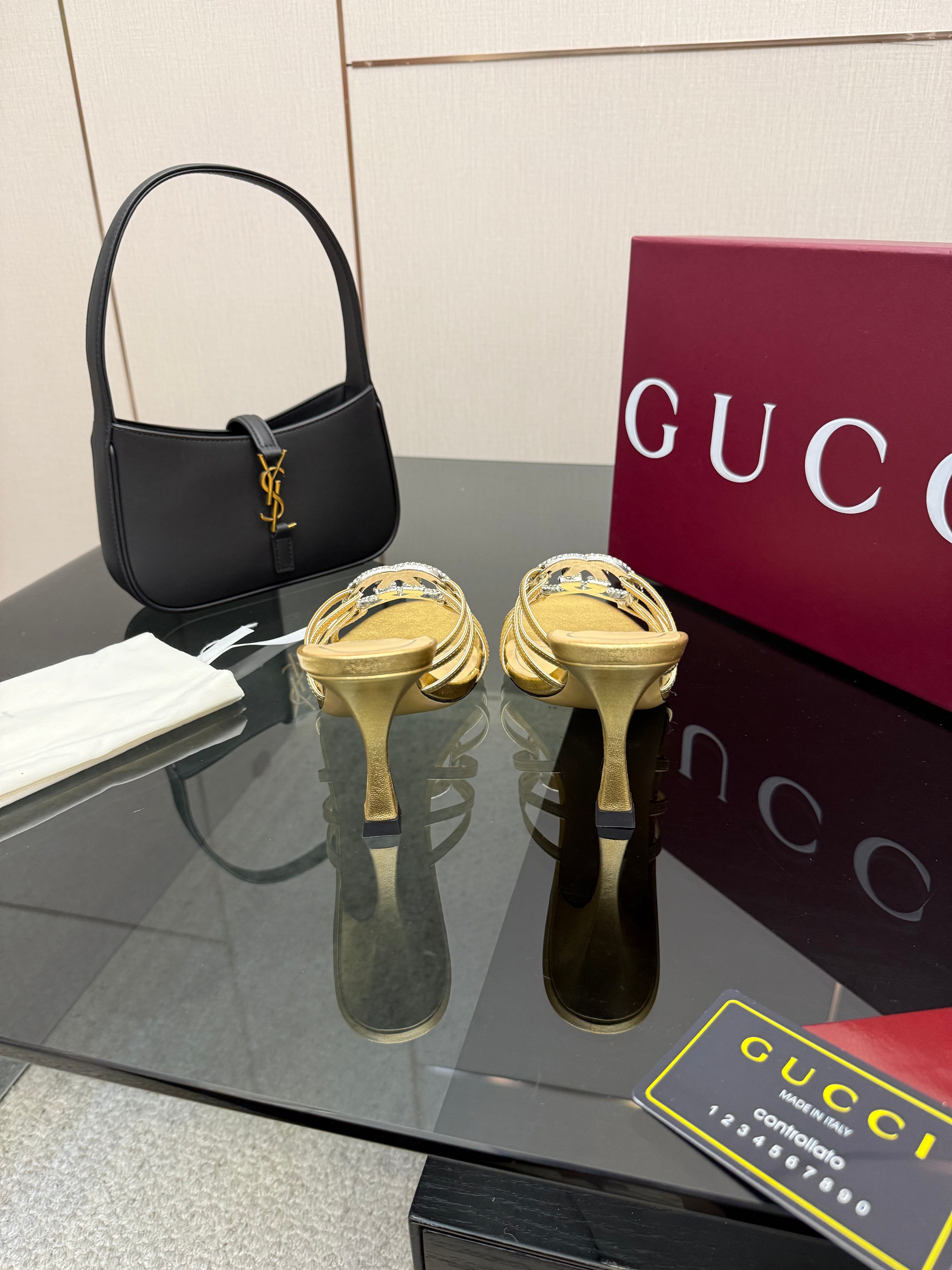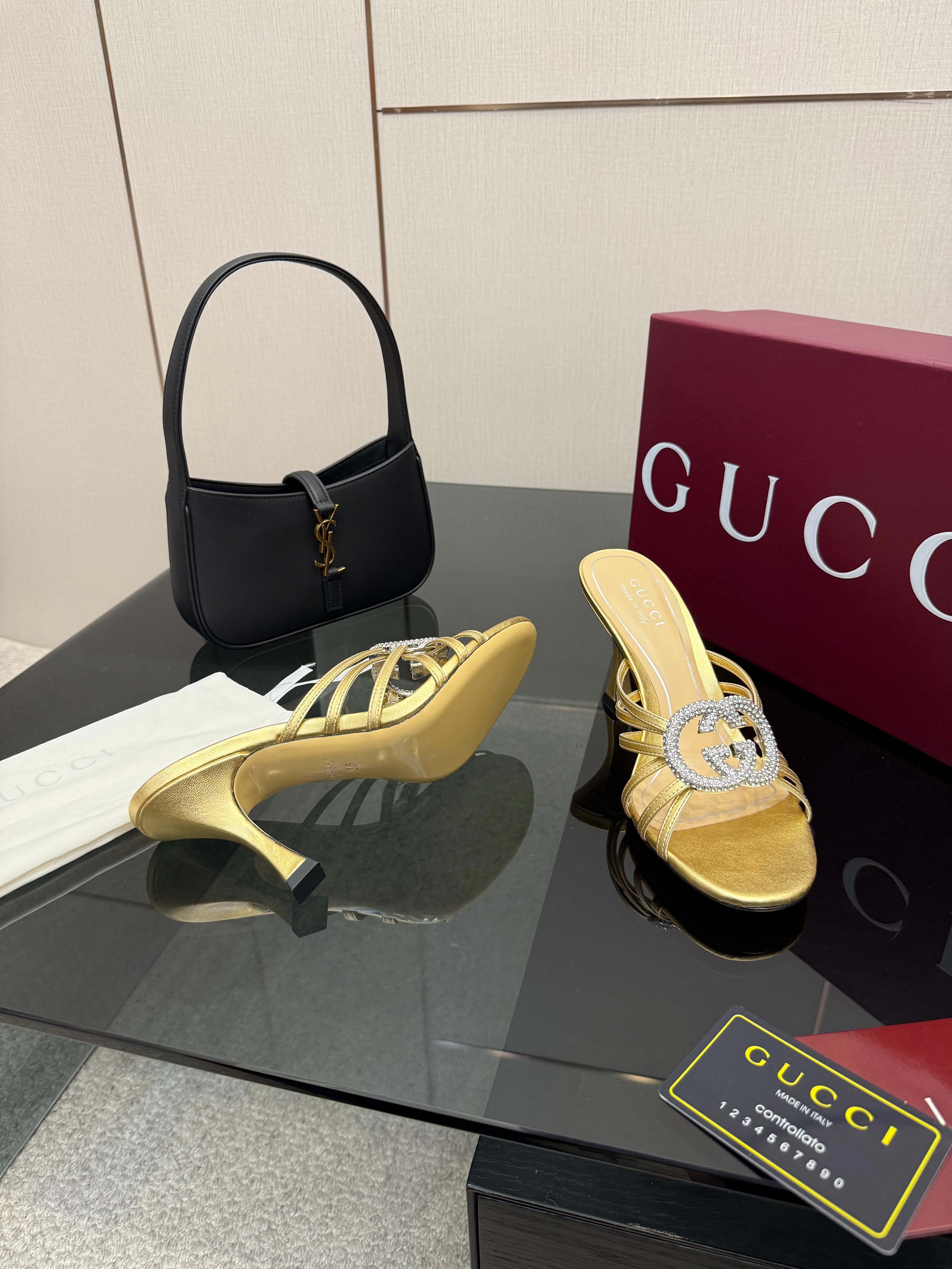 Women's Slide 85mm With Crystal Interlocking G Gold Leather
