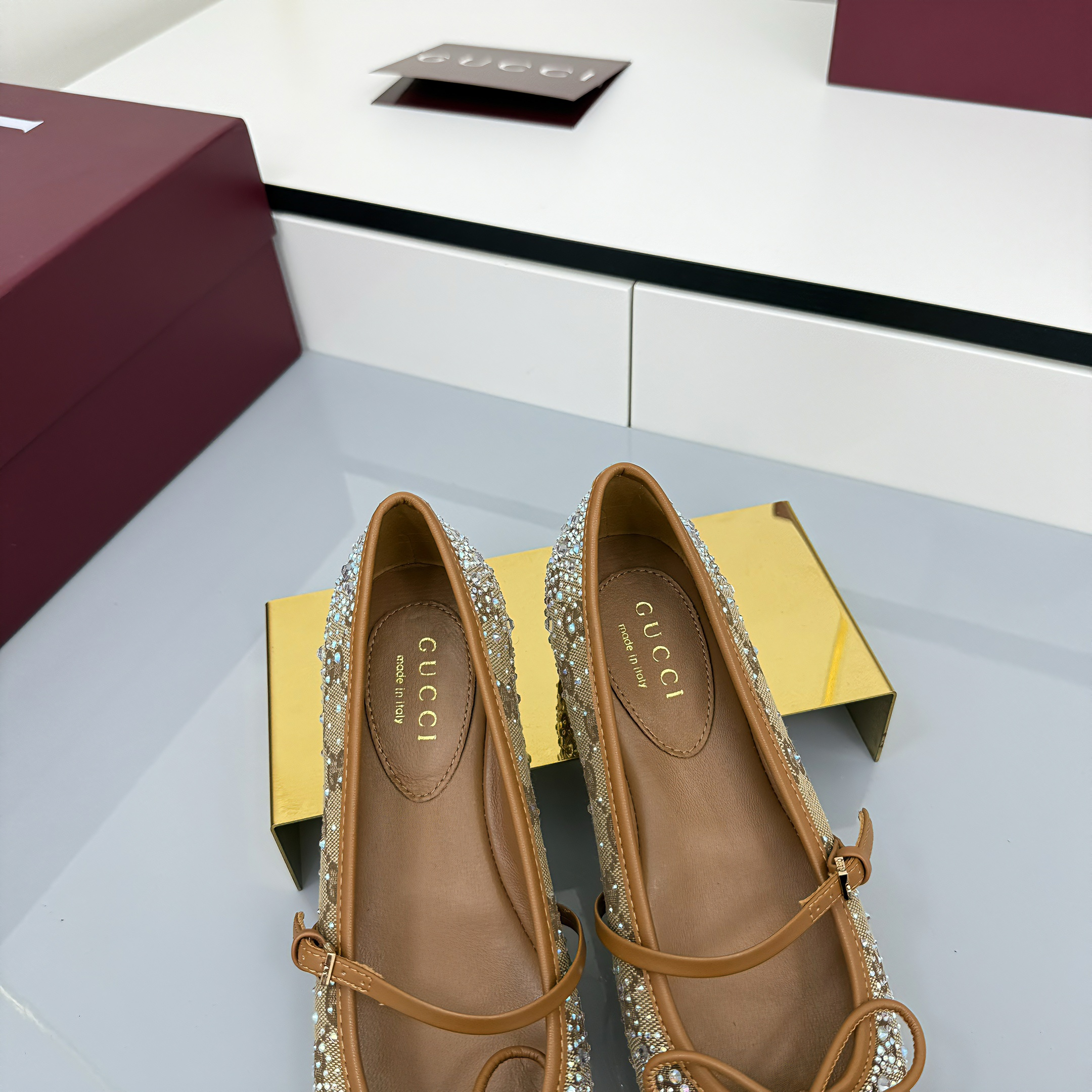 GG Women's Crystal Horsebit Ballet Flat Beige and Dark Brown Canvas 511209