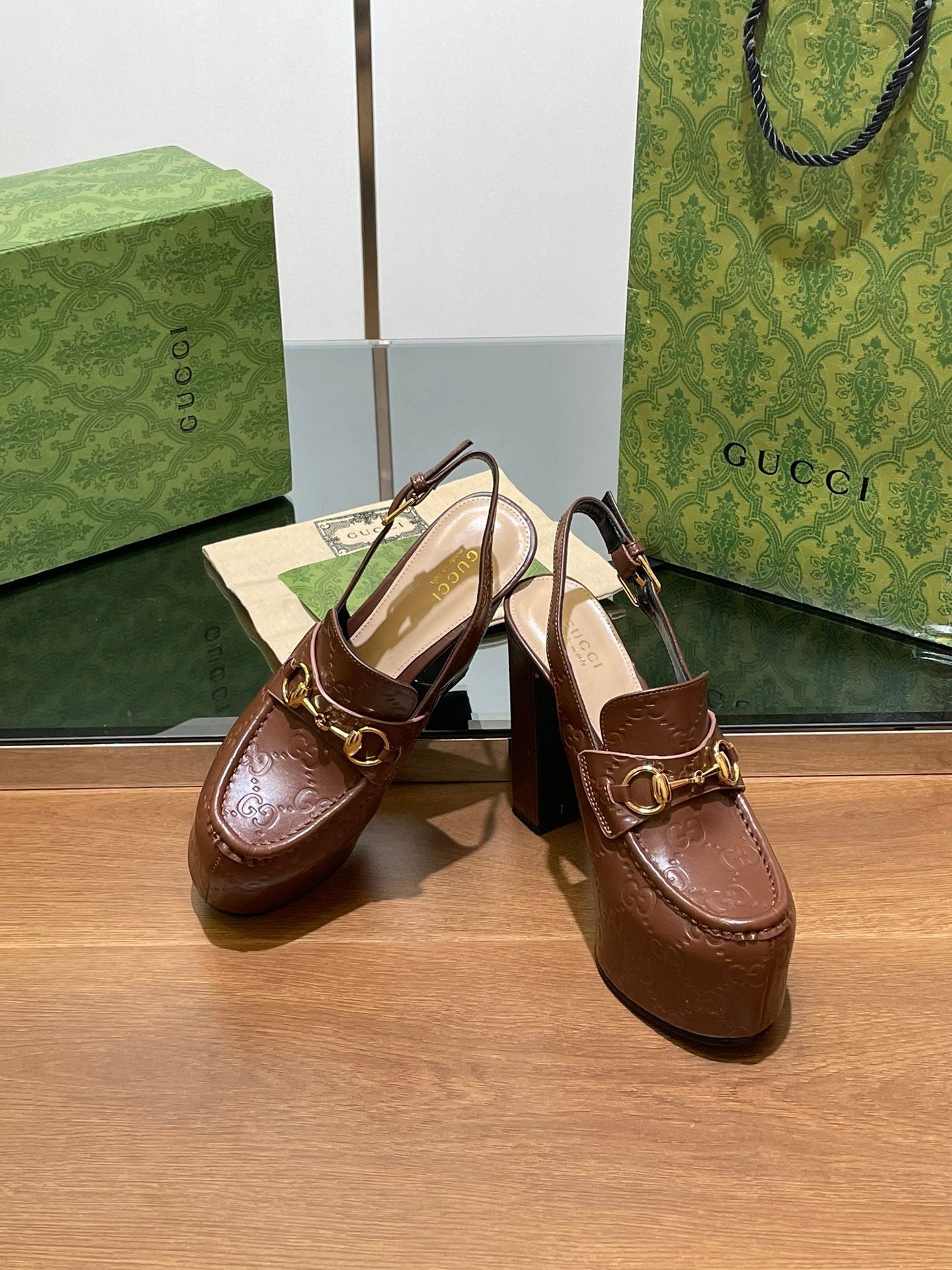 GG WOMEN'S HORSEBIT PLATFORM SLINGBACK IN DARK BROWN EMBOSSED CALFSKIN