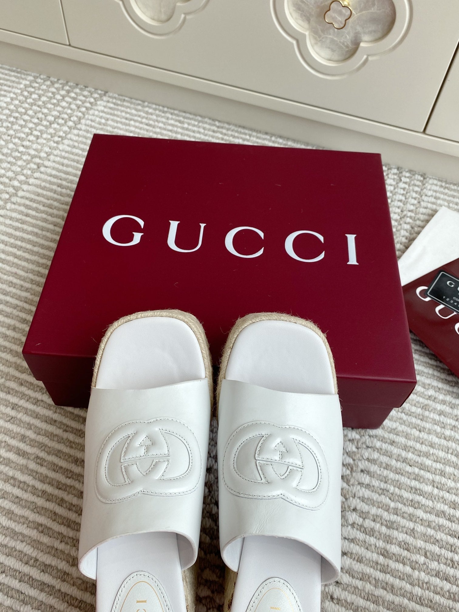 GC Double G Slide Sandals White Embossed Leather 294635