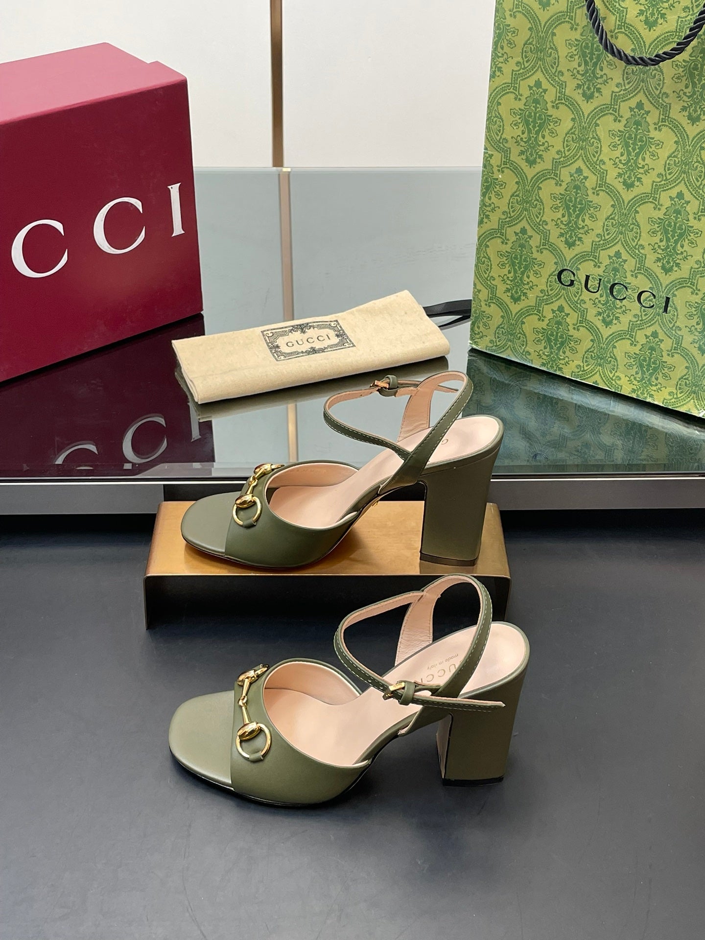 GG Women Horsebit High Heel Sandal Open Toe Olive Sheepskin 149217