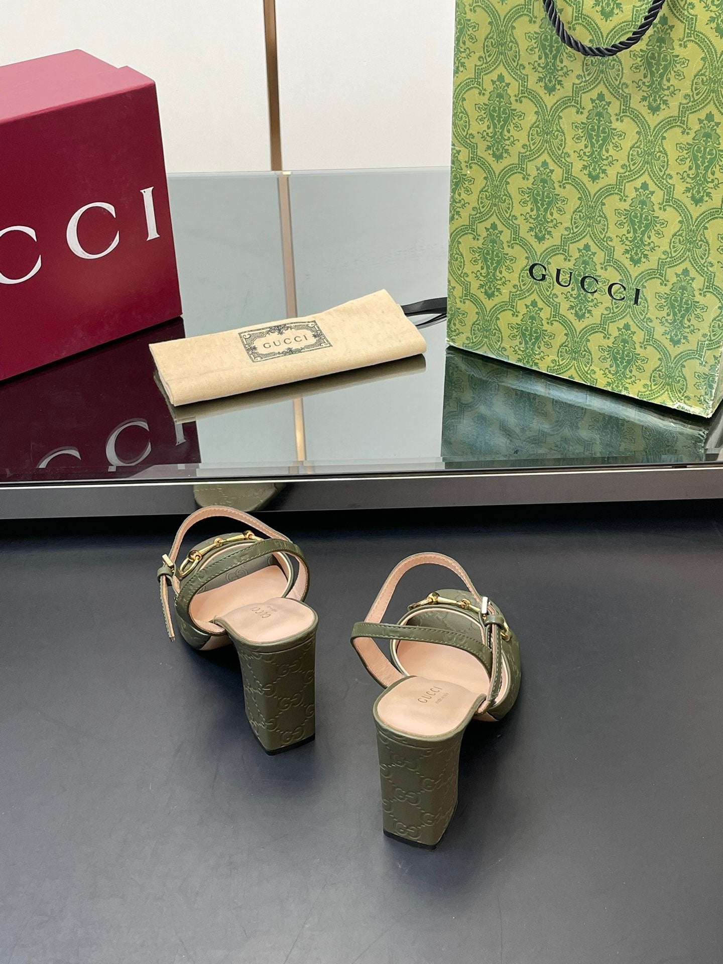 GG Women Horsebit Embossed High Heel Sandal Open Toe Olive Sheepskin 149219